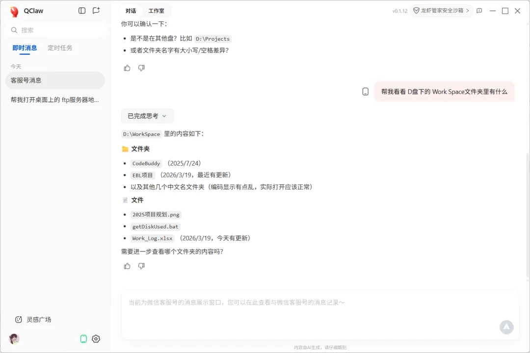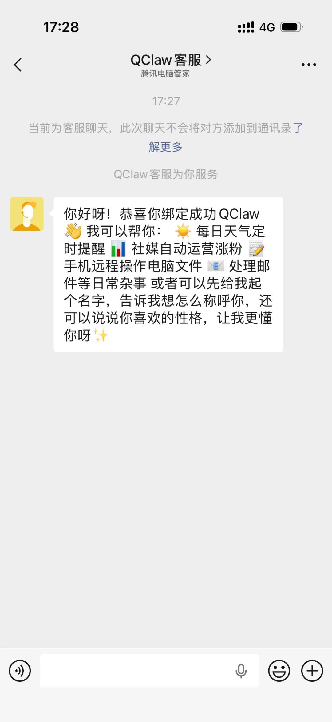 微信聊天列表会出现一个 “QClaw客服消息” 的对话框。