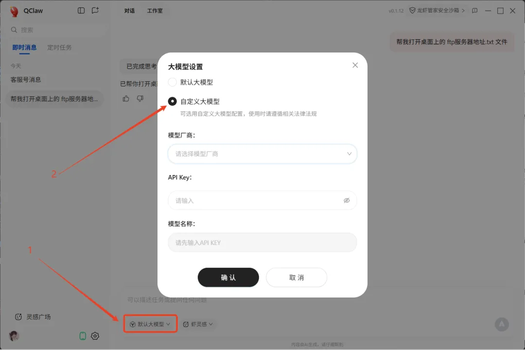 要用豆包、通义千问等其他模型,进入“模型配置”页面,选择“自定义模型”,填入对应厂商的 模型名称 和 API Key 就可以。