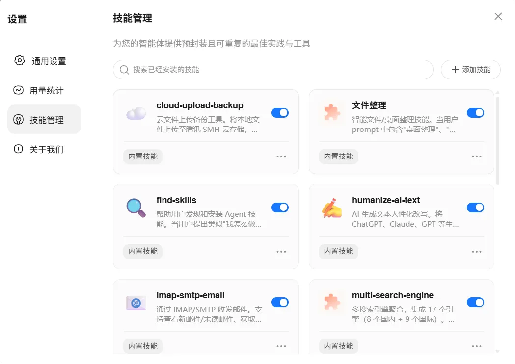 技能是 QClaw 实现各种操作的基础。安装完成后,基础技能包会自动启用。