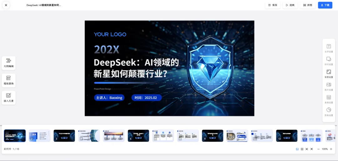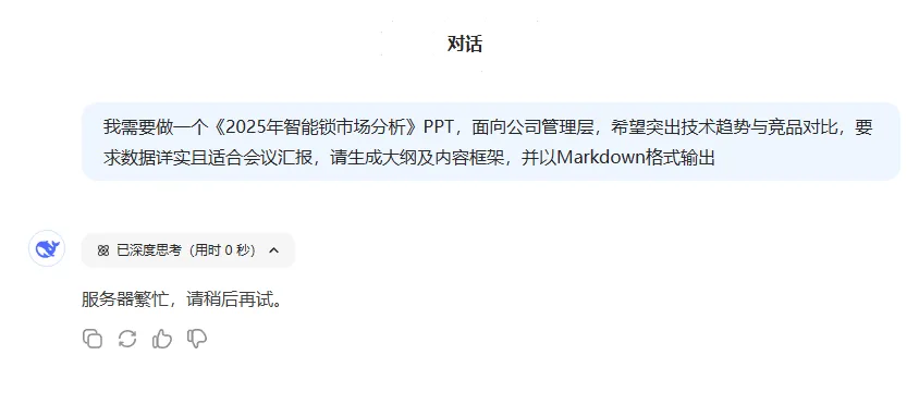 PS:这里也可以根据需要继续补充对话,比如补充更详细的背景信息,提供具体的数据支撑,让DeepSeek再次生成更符合你的PPT大纲和内容框架。