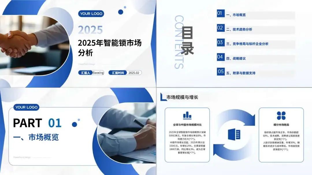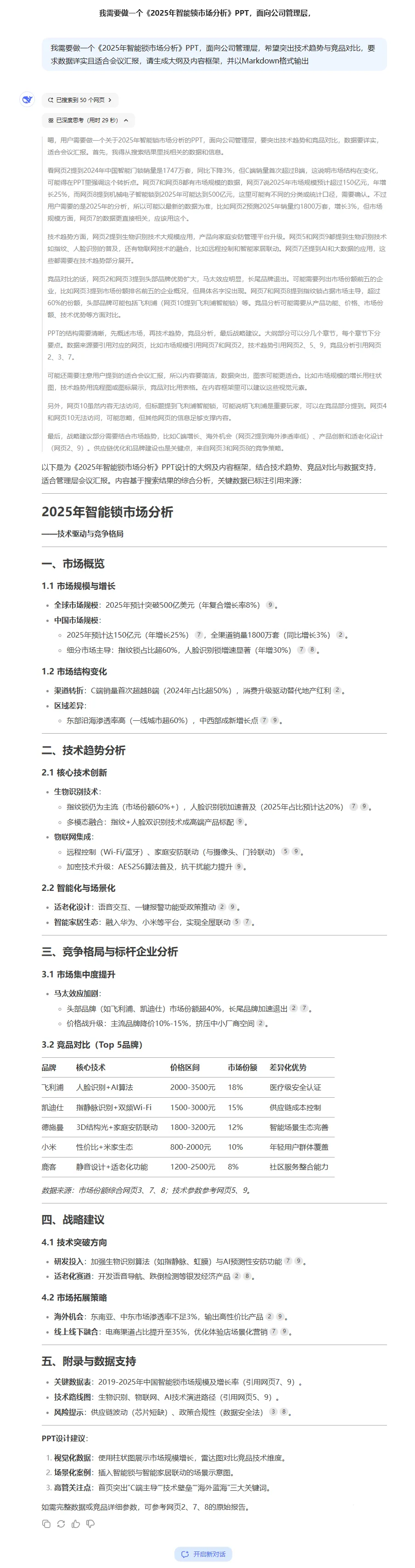 “我需要做一个《2025年智能锁市场分析》PPT,面向公司管理层,希望突出技术趋势与竞品对比,要求数据详实且适合会议汇报,请生成大纲及内容框架,并以Markdown格式输出