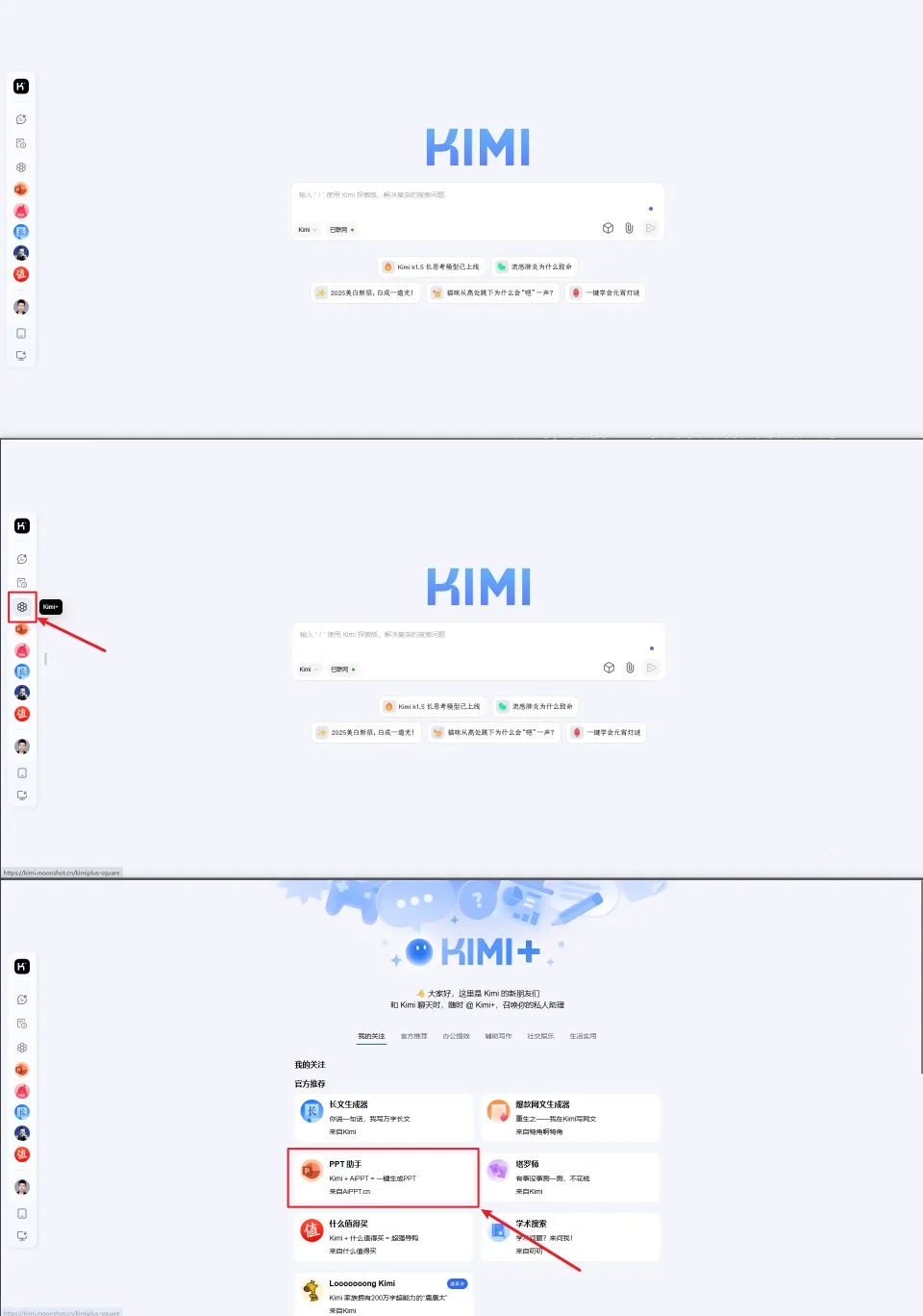 打开Kimi → 点击左侧“Kimi+” → 选择“PPT助手”