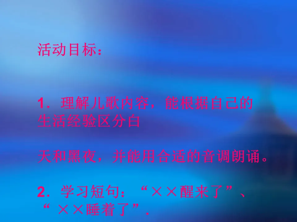 1、分别出示太阳和月亮,提问:太阳出来了,照在身上暖洋洋的,小朋友看一看谁醒来