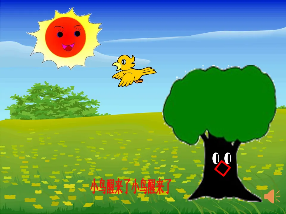 幼儿:小鸟醒来了,小树醒来了,小朋友醒来了……
