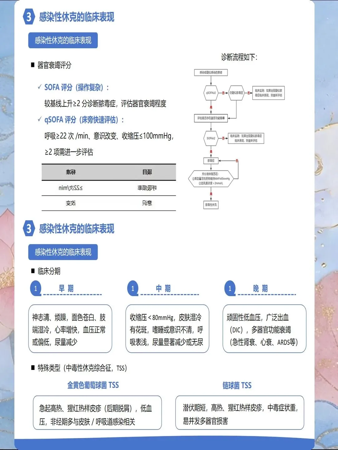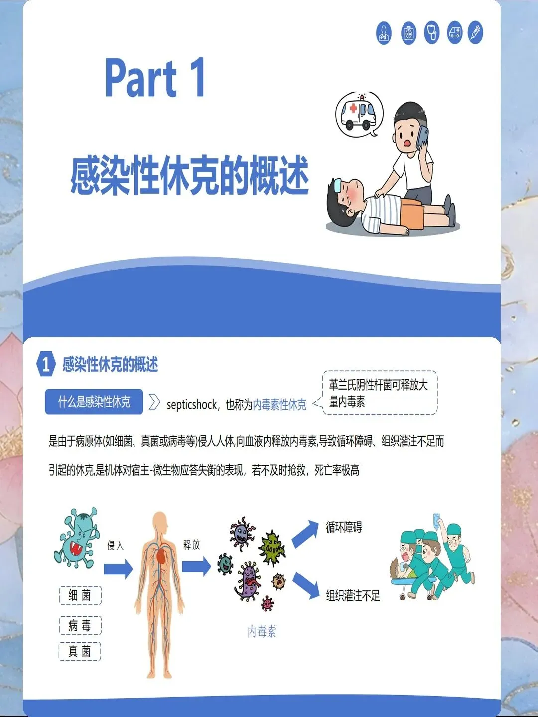 早期识别是感染性休克救治成功的关键。qSOFA评分是快速识别的重要工具,包括呼吸频率≥22次/分、意识改变、收缩压≤100mmHg三项,符合两项即提示可能存在脓毒症。更精确的评估需要使用SOFA评分,涵盖呼吸、凝血、肝脏、心血管、中枢神经、肾脏六个系统,评分≥2分提示器官功能障碍。此外,乳酸水平≥2mmol/L也是重要预警指标。护士要密切观察患者的生命体征变化,特别是体温、心率、呼吸、血压,注意有无皮肤花斑、毛细血管再充盈时间延长、尿量减少等组织灌注不良的征象。一旦识别感染性休克,立即启动复苏流程。液体复苏是感染性休克治疗的基石。2018年拯救脓毒症运动指南推荐,在最初3小时内给予至少30ml/kg晶体液快速输注,首选平衡盐溶液,避免大量使用生理盐水引起高氯性酸中毒。液体复苏过程中要密切监测血流动力学变化,包括血压、心率、中心静脉压、尿量、每搏变异度等,评估容量反应性。对于容量反应性良好的患者,可继续液体复苏;对于容量无反应者,需警惕液体过负荷,及时调整策略。护士要快速建立两条以上大孔径静脉通路,必要时建立中心静脉通路,保证液体快速输注。准确记录液体出入量,每小时总结一次,评估液体平衡状态。