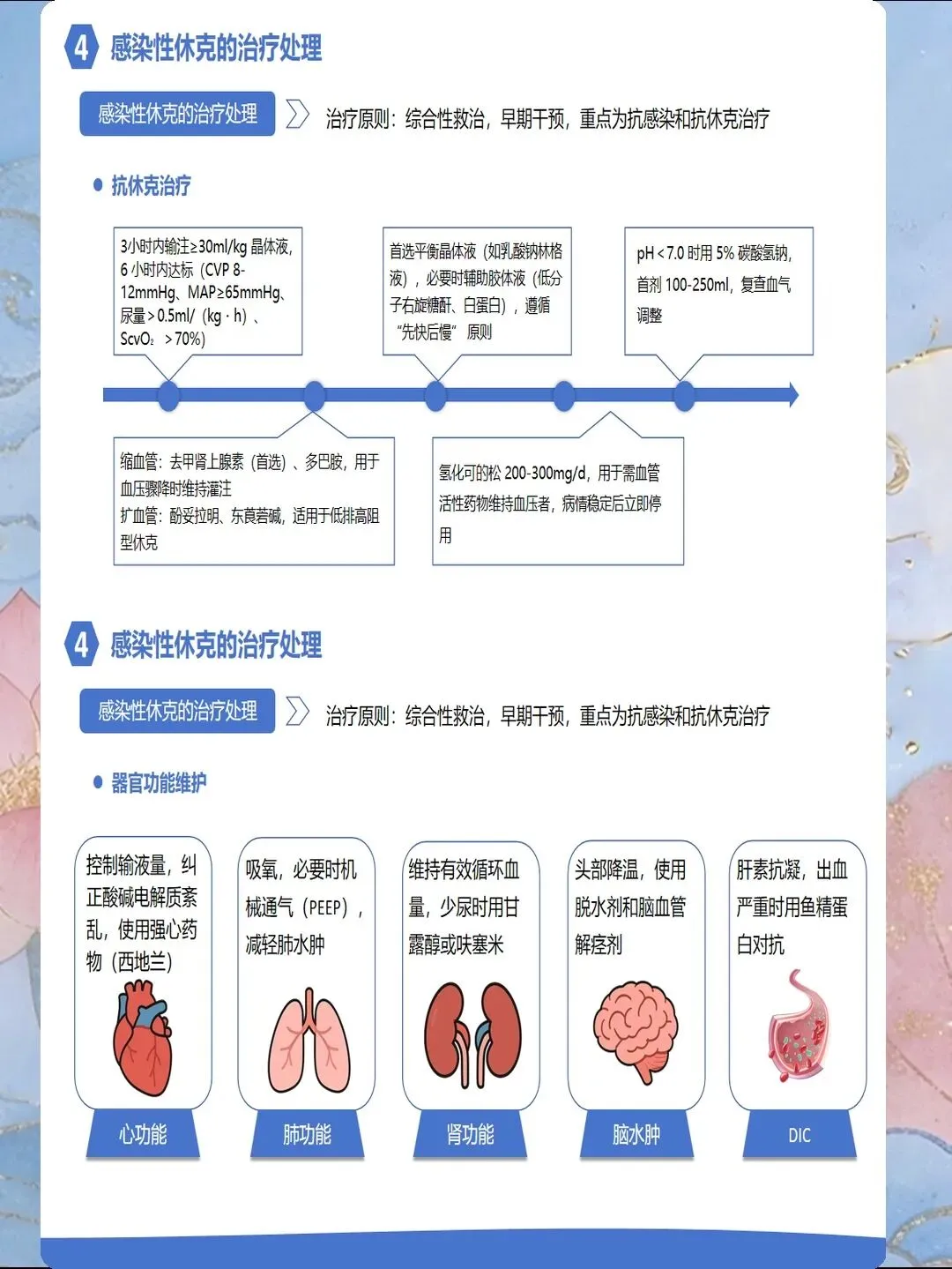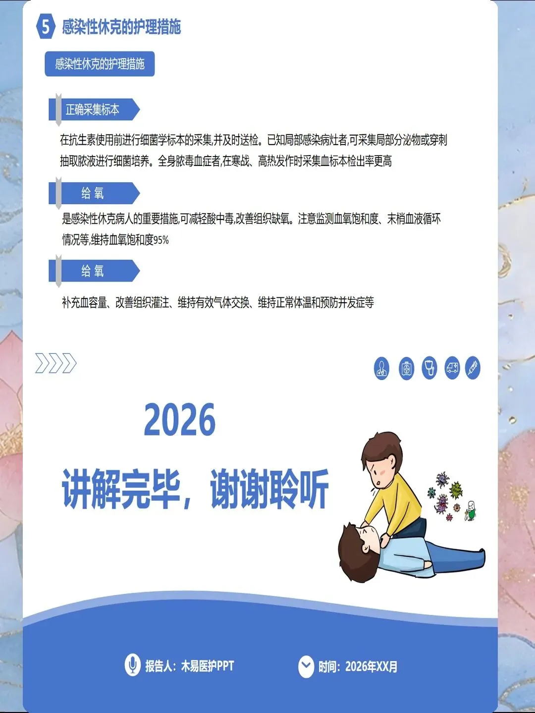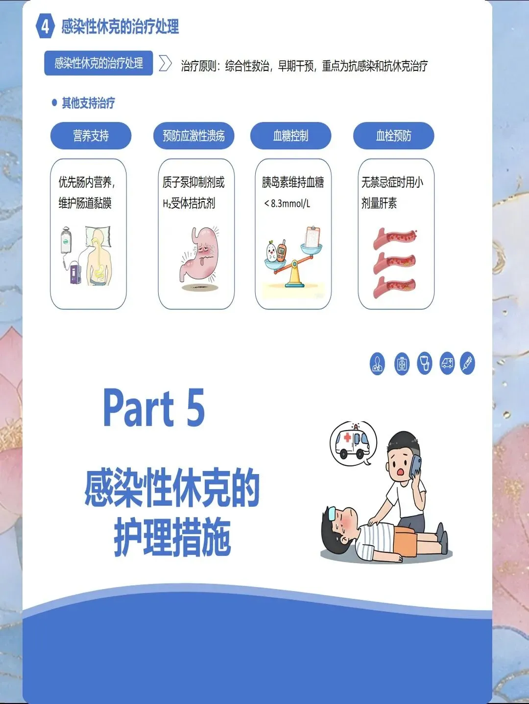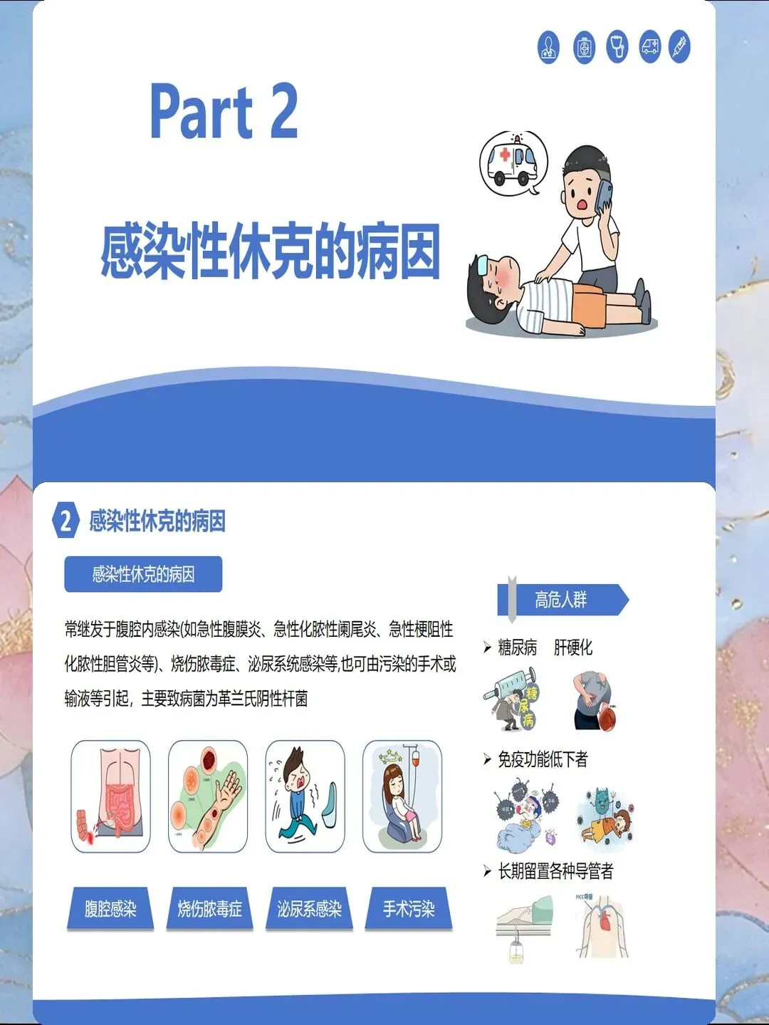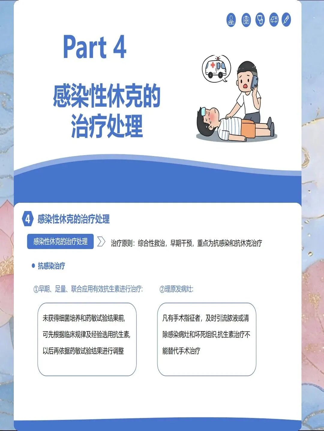 抗生素的早期应用是控制感染的关键。一旦怀疑感染性休克,应在1小时内经验性使用广谱抗生素,覆盖可能的病原菌。抗生素选择要基于感染来源、患者基础疾病、当地耐药流行病学等因素。随后根据微生物培养结果和药敏试验,调整为目标性治疗。护士要确保抗生素及时准确给药,记录给药时间,监测药物疗效和不良反应。对于感染源明确的患者,要积极配合感染源控制,如脓肿引流、感染坏死组织清除等。