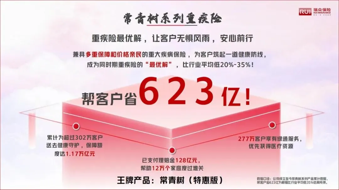 •常青树重疾险:行业性价比标杆,价格比行业平均低20%-35%,累计为302万客户提供1.17万亿元保障,支付理赔金128亿元,帮助12万个家庭渡过难关。