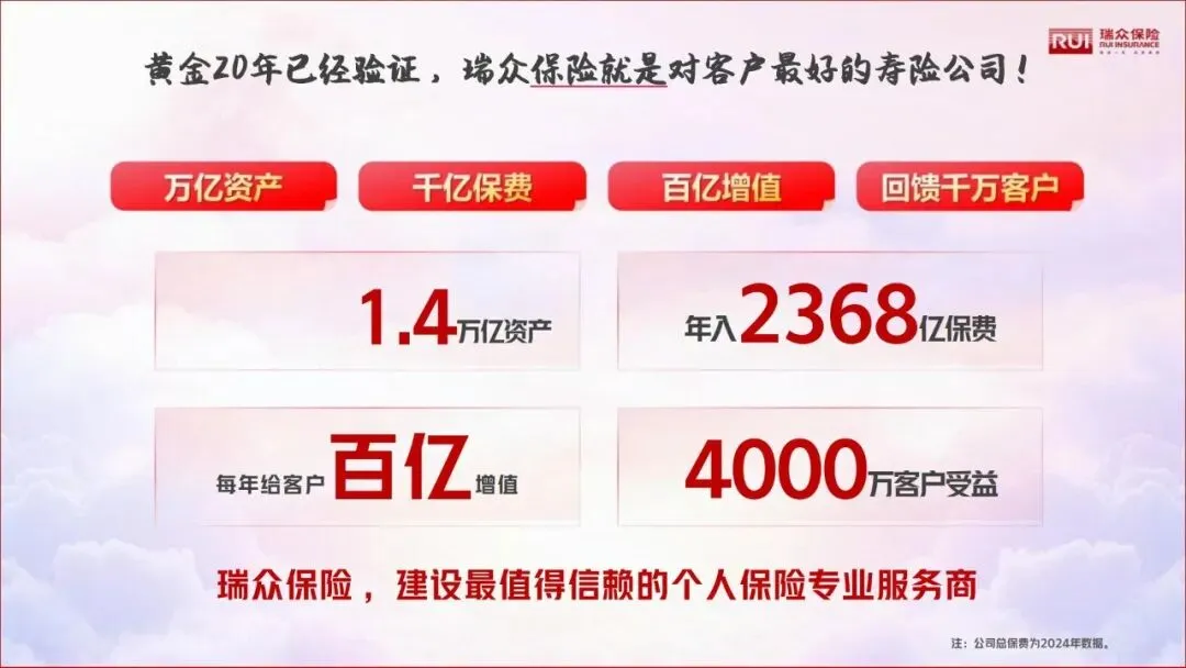 瑞众保险现已坐拥1.4万亿总资产,2024年总保费收入达2368亿元,每年为客户实现百亿级财富增值,累计服务超4000万客户。从普通家庭到高净值人群,从健康保障到财富规划,瑞众用全周期服务,成为千万家庭的信赖之选。