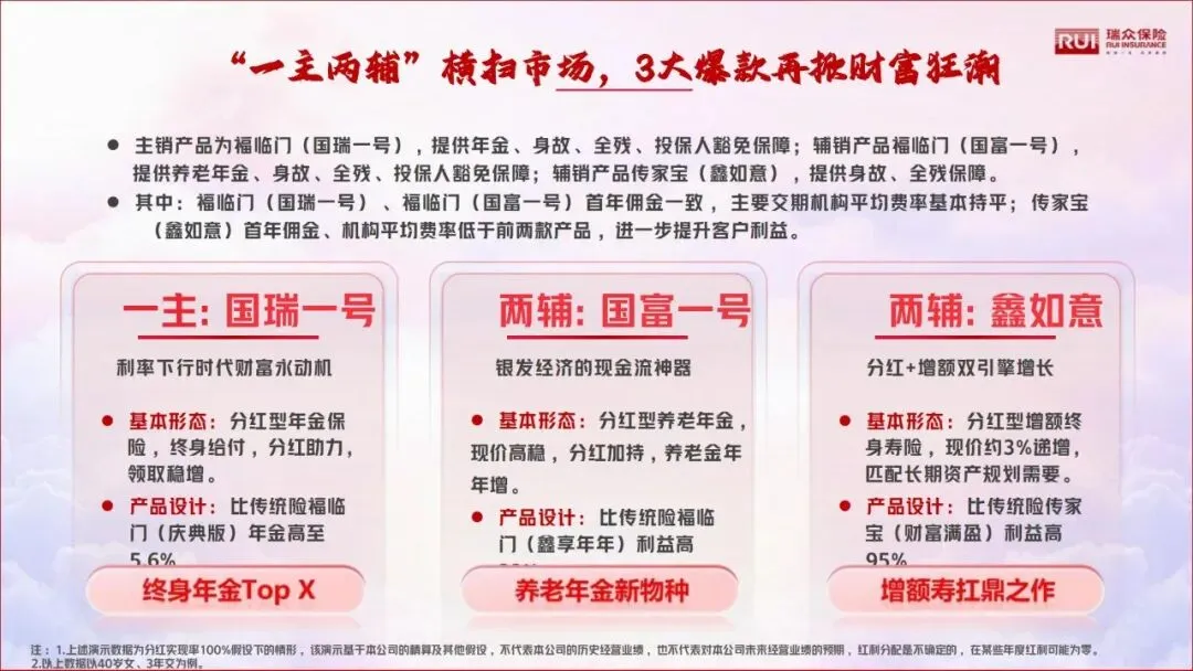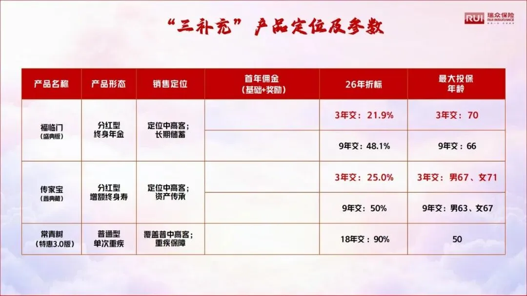 作为主销产品,福临门(国瑞一号)是分红型终身年金险,覆盖全客群,具备终身给付、分红助力、领取稳增的特点。产品设计比传统年金险利益更高,3年交折标20%,最高投保年龄70岁,机构获费高,是市场通杀型爆款。