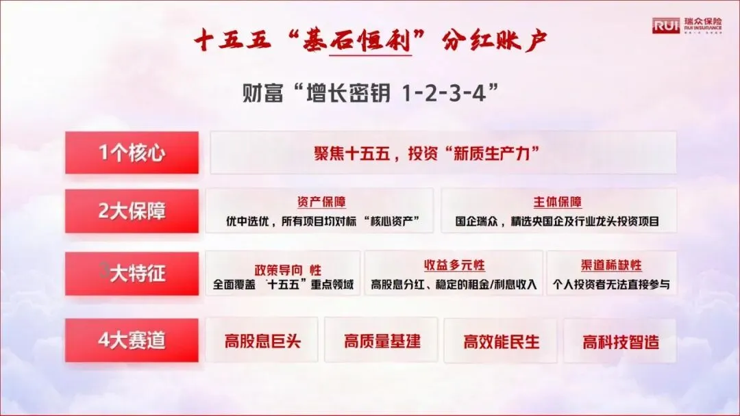 瑞众专属“基石恒利”永续分红账户,是十五五战略执行账户,精选12家以上央国企及行业龙头项目,构建超优质资产包,为分红收益提供强力支撑。