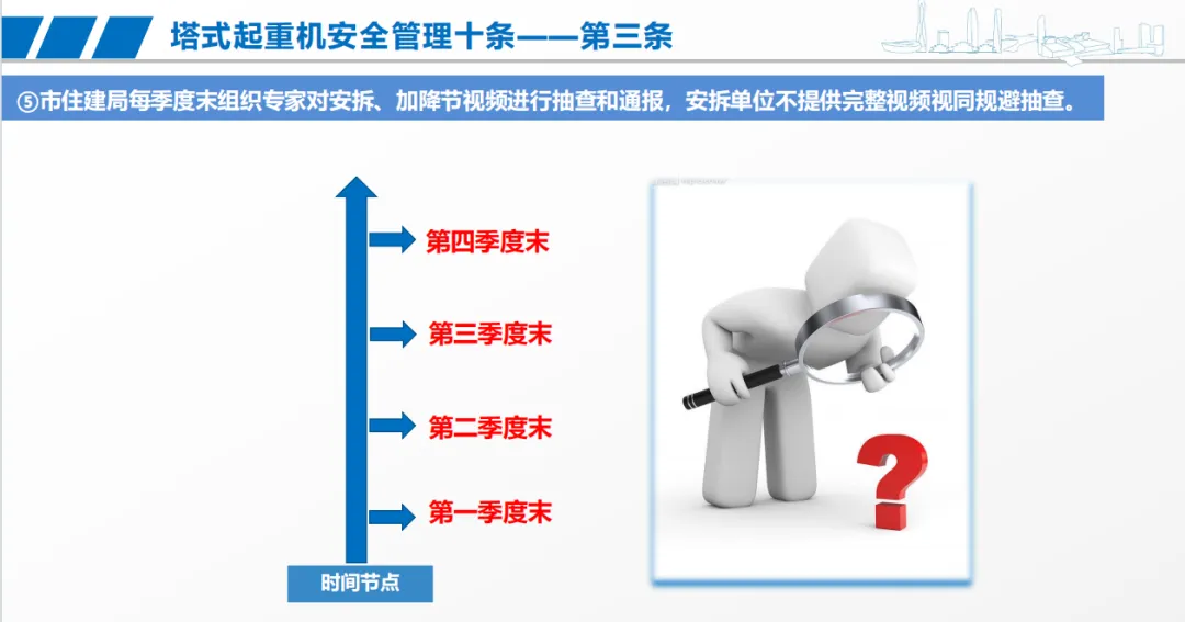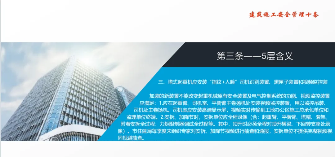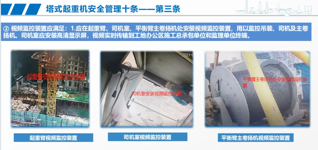 塔机吊钩可视化视频监控装置应满足:1.应在起重臂、司机室、平衡臂主卷扬机处安装视频监控装置,用以监控吊装、司机及主卷扬机。司机室应安装高清显示屏,视频实时传输到工地办公区施工总承包单位和监理单位终端。 已关注 关注 重播 分享 赞 视频详情