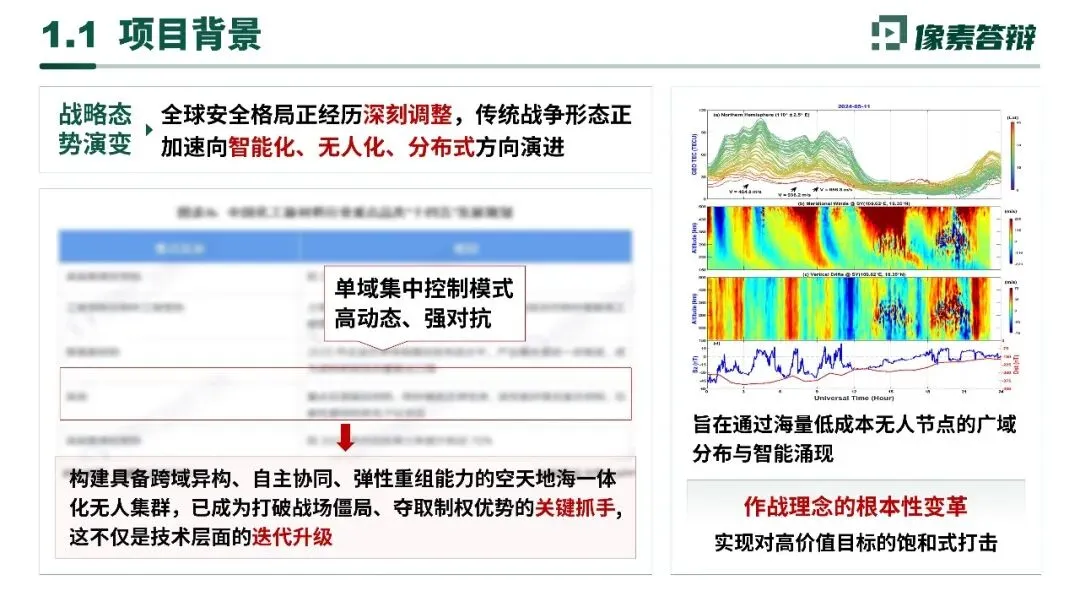- 战略需求全球战争形态向智能化、无人化、分布式演进,传统单域集中控制模式已无法适应高动态、强对抗战场,构建跨域自主协同无人集群是夺取制权的核心抓手。