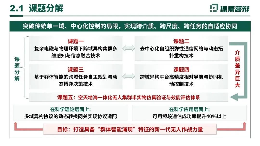 课题一:复杂电磁与物理环境下跨域异构集群多维感知与信息融合课题二:去中心化自组织弹性通信网络与动态拓扑重构技术课题三:基于群体智能的跨域任务自主规划与动态博弈决策技术课题四:跨域异构平台高精度相对导航与协同机动控制技术课题五:空天地海一体化无人集群半实物仿真验证与效能评估体系三、关键技术突破