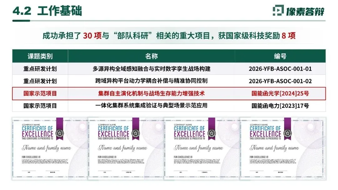 - 前期积累已承担 30 项部队科研重大项目,获国家级科技奖励 8 项,包括 “集群自主演化机制与战场生存能力增强技术” 等国家示范项目。