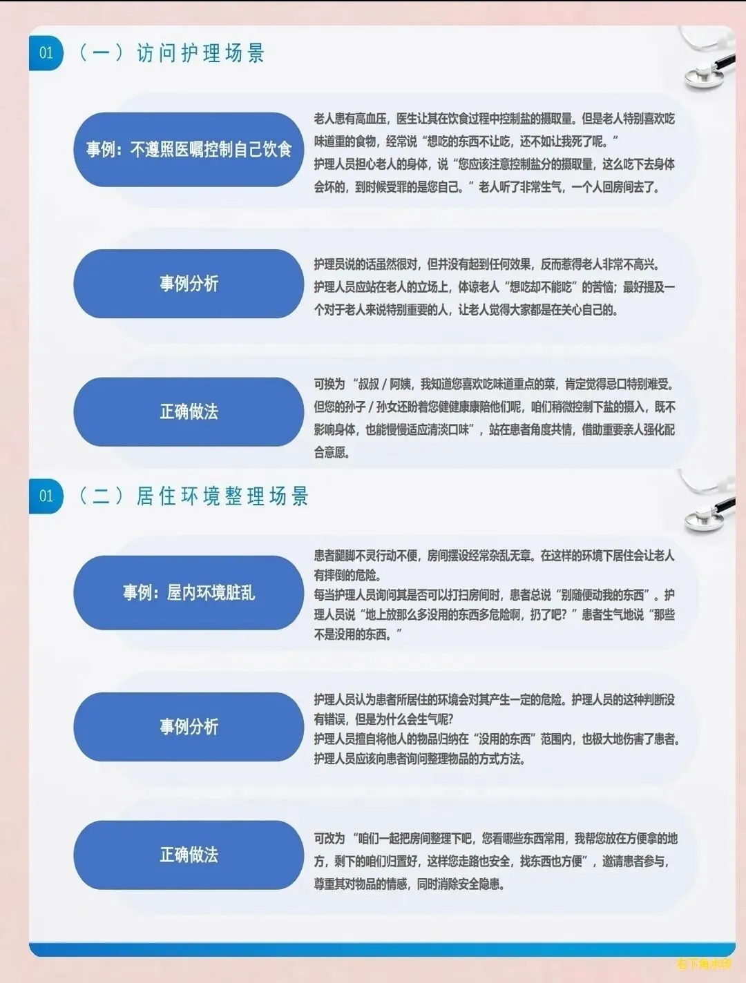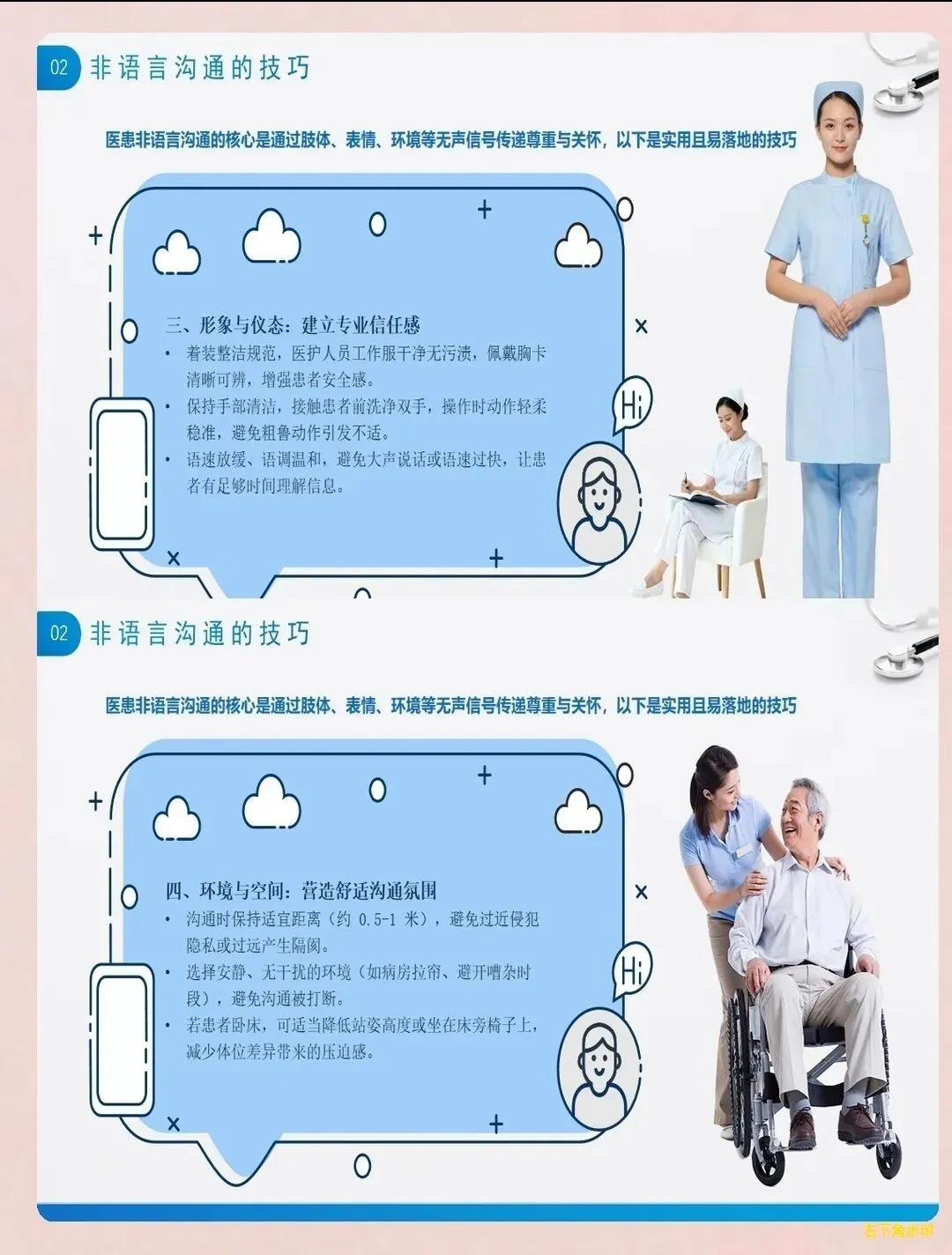 - 适当触摸(为老年患者整理被褥、轻轻拍手背安慰)这些非语言信息,往往能建立更深的信任连接。
