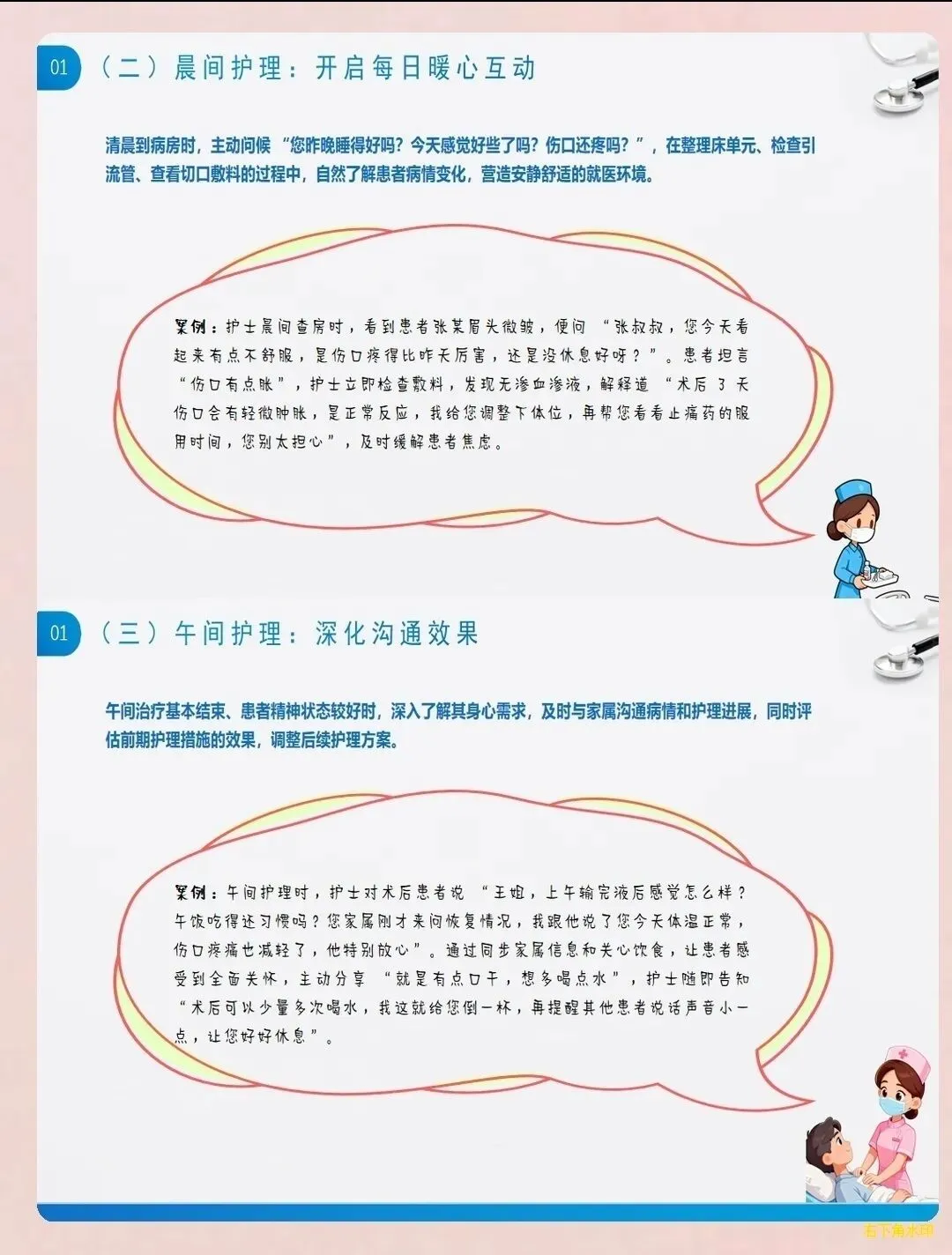 实战场景:晨间护理时,不是简单问"昨晚睡得好吗?",而是具体化:"昨晚您翻身的次数好像有点多,是伤口疼还是别的原因?"这样的主动关怀,能让患者感受到真正的关心。
