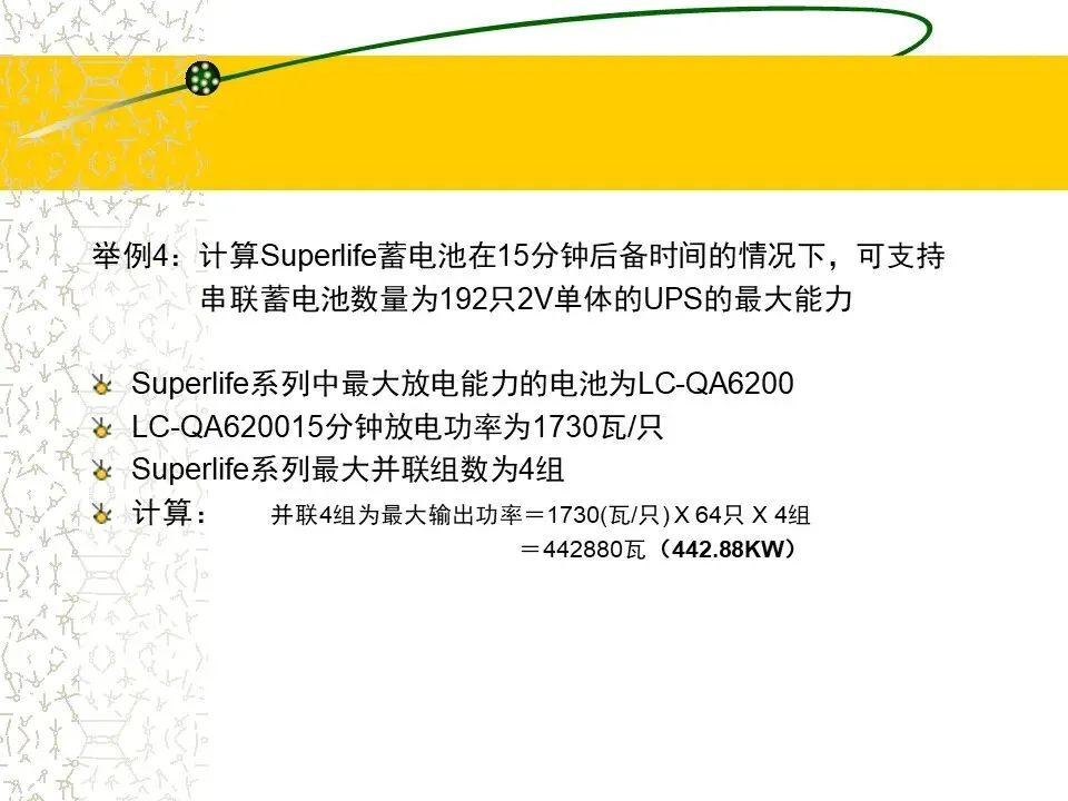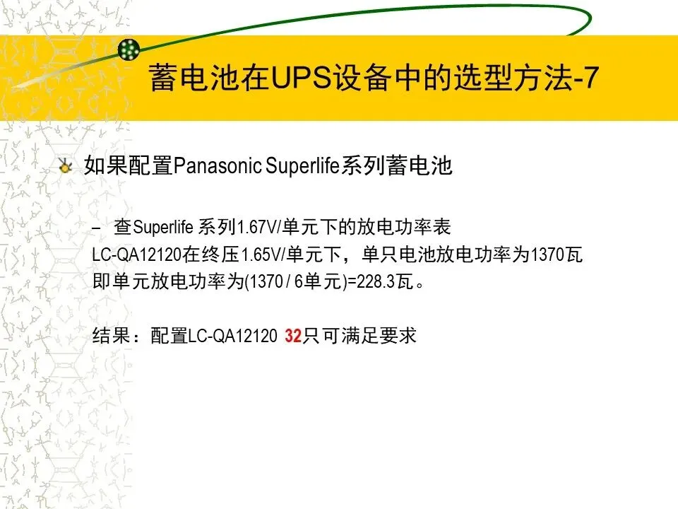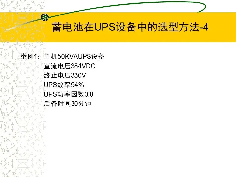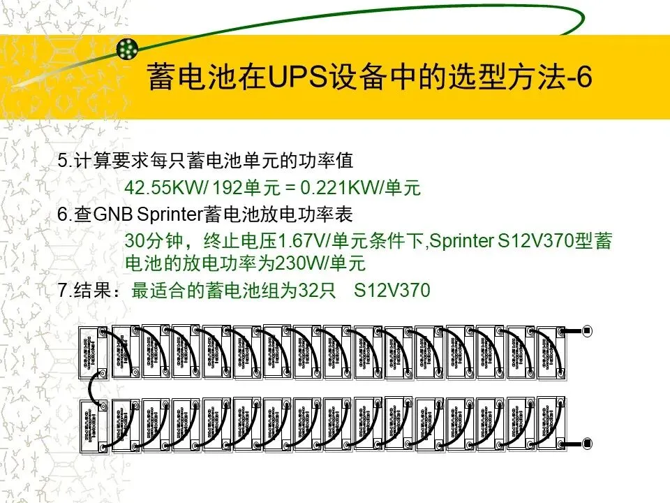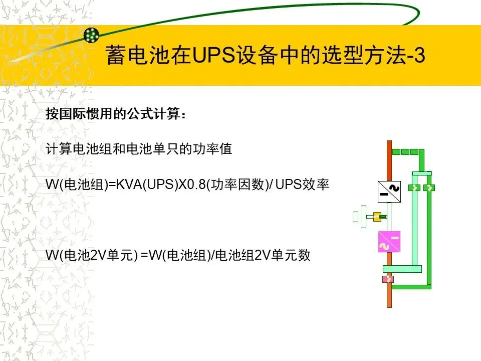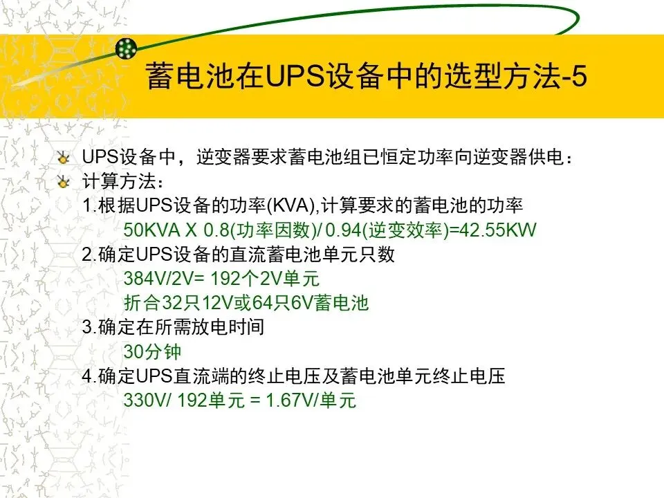 1.根据UPS设备的功率(KVA),计算要求的蓄电池的功率