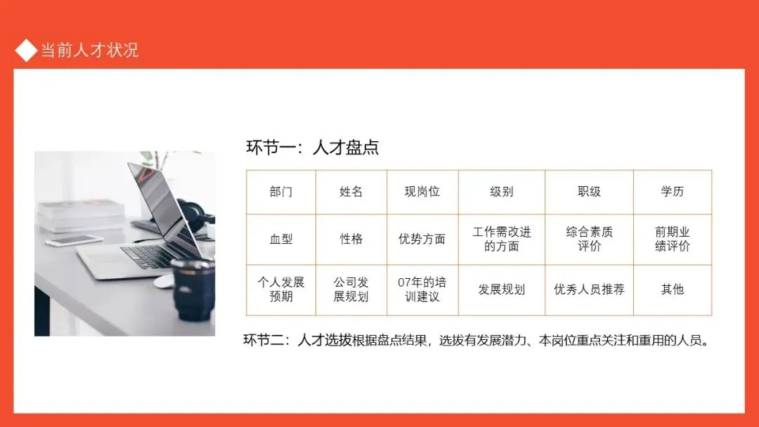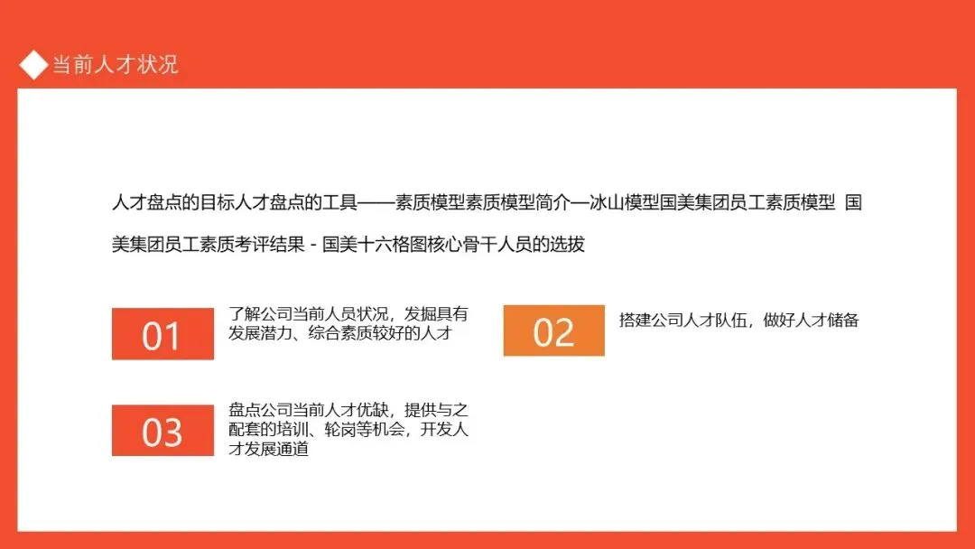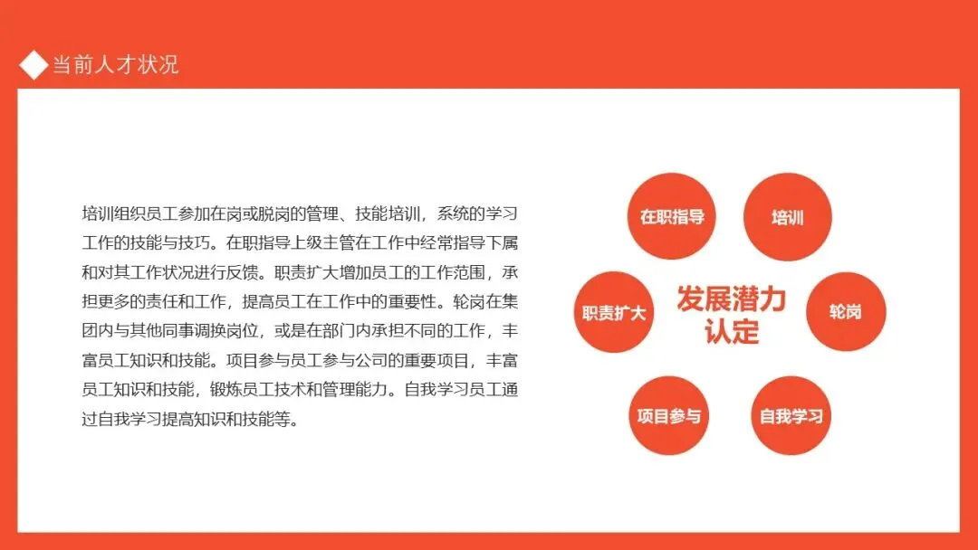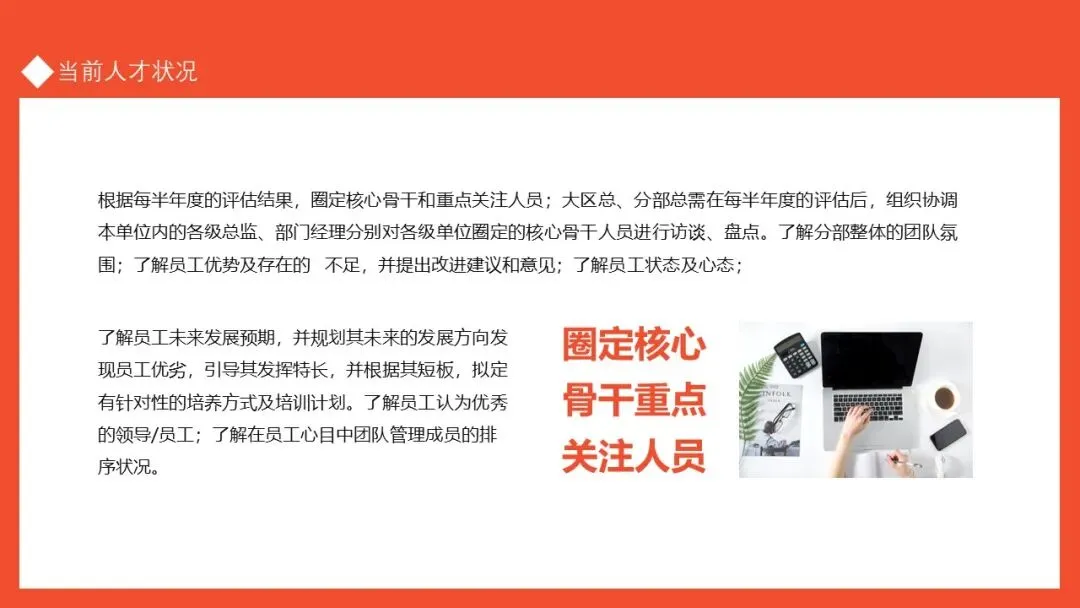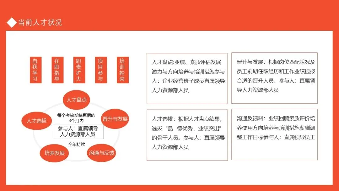 人才盘点并非简单的人员信息统计,而是要通过全面的评估,了解企业当前的人员状况,发掘具有发展潜力、综合素质较好的人才;搭建企业的人才队伍框架,做好各层级、各岗位的人才储备,避免人才断层;精准定位人才优劣势,为人才提供配套的培训、轮岗等发展机会,针对性开发人才发展通道,让人才能力与企业需求相匹配。