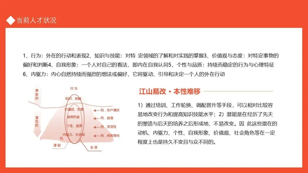 以冰山模型为核心的素质模型,是人才评价的重要工具。冰山模型将人才素质分为 “表象部分” 和 “潜在部分”,表象部分包括员工的行为、知识与技能,可通过培训、实践快速提升;潜在部分包括价值观与态度、自我形象、个性与品质、内驱力,是人才素质的核心,具有稳定性和独特性,直接决定员工的长期发展潜力。在人才评价中,既要关注员工的专业知识、工作技能等表象素质,更要重视其价值观、责任心、成就导向、团队合作等潜在素质,确保选拔的人才不仅 “有能力”,更 “合心意”。