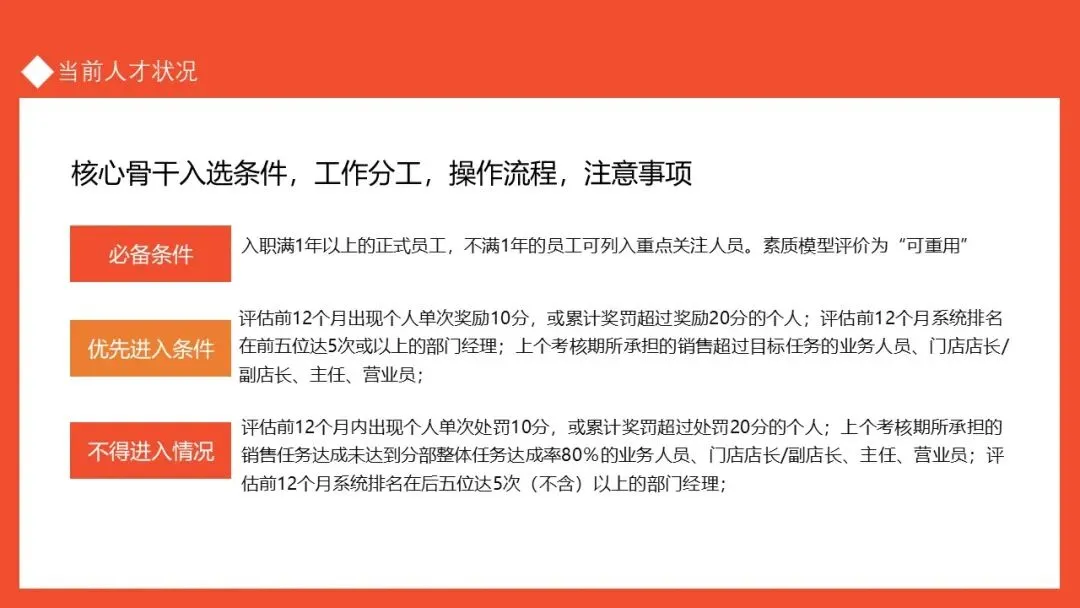 必备条件需明确入职年限、素质模型评价等级等基础要求;优先进入条件向业绩突出、表现优秀的员工倾斜,如考核期销售超额完成、系统排名靠前、获得企业奖励的员工;不得进入情况则针对表现不佳、存在违规行为的员工,如业绩未达标、受到企业处罚、系统排名靠后的员工。