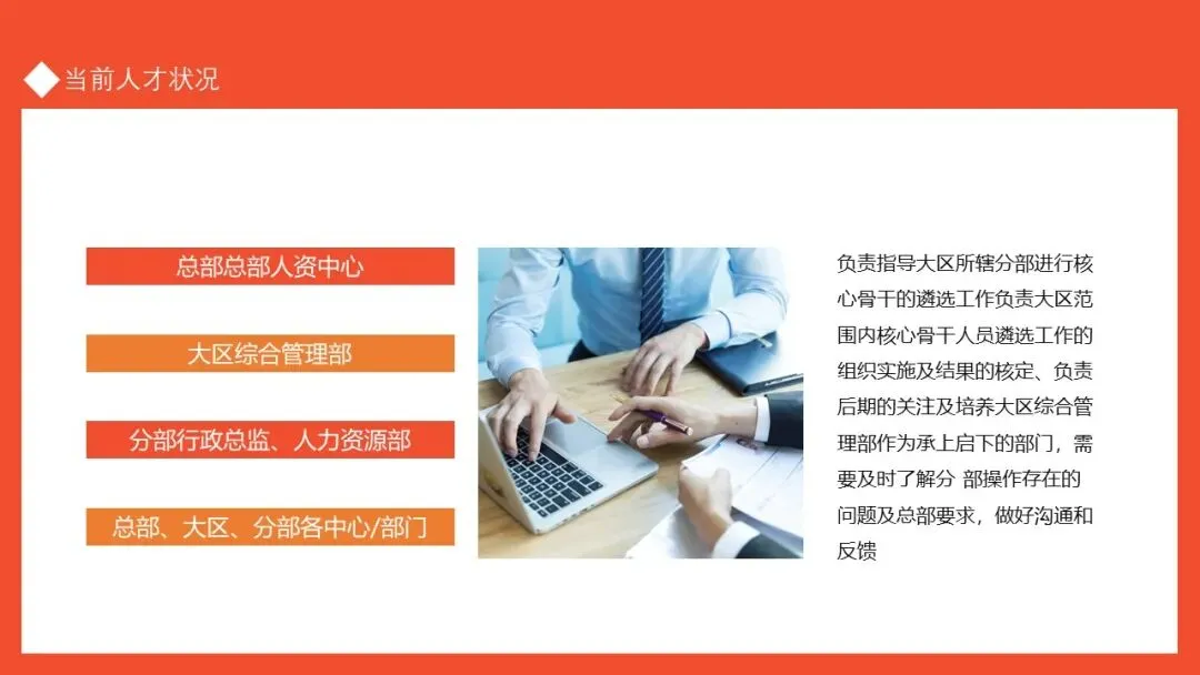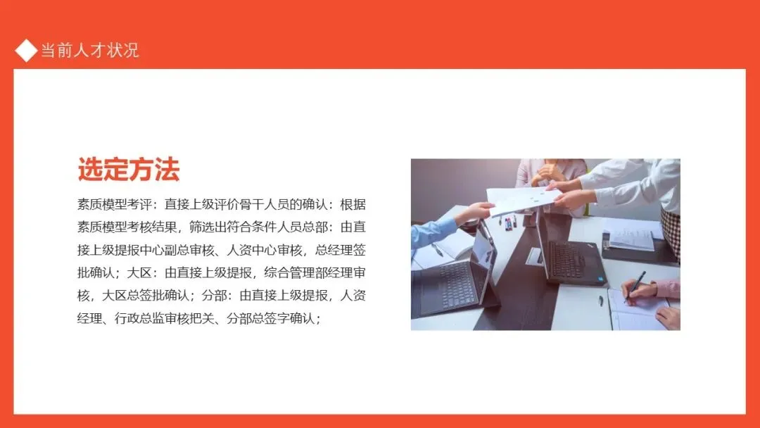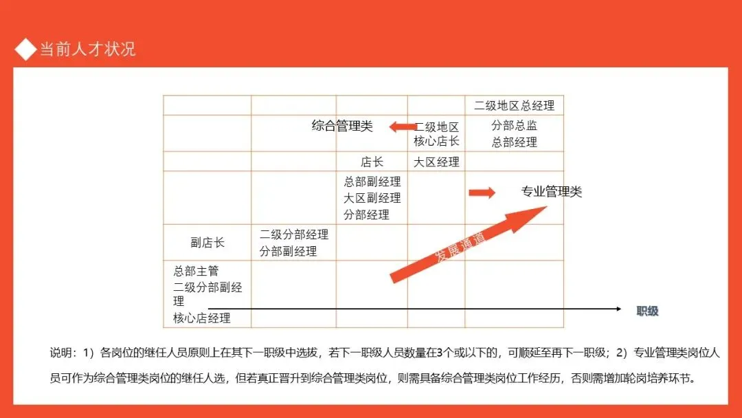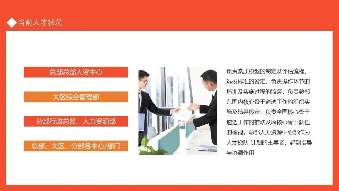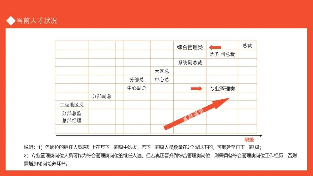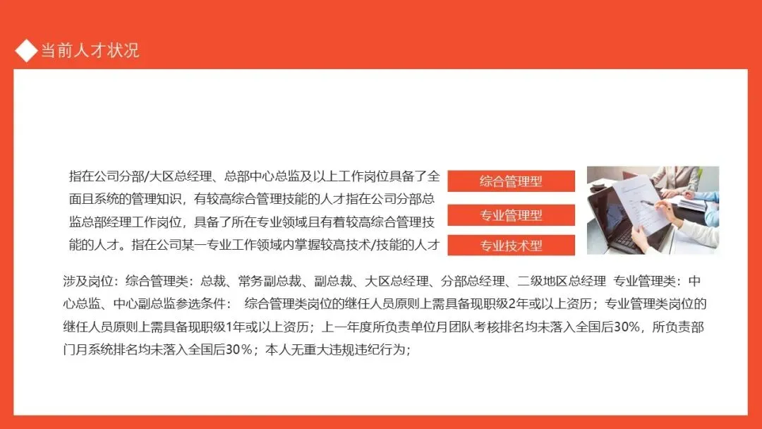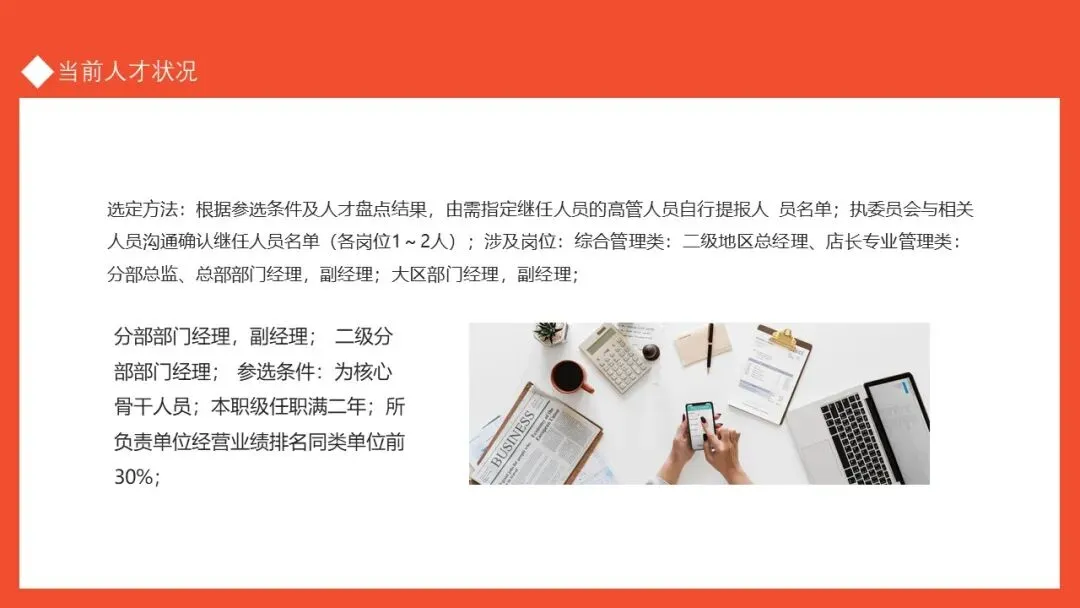 1. 继任人员梯队:分为核心继任和一般继任,核心继任针对企业高层和重要中高层岗位,如综合管理类的总裁、大区总经理,专业管理类的中心总监、分部总监;一般继任针对企业中基层重要岗位,如二级地区总经理、店长、总部部门经理。继任人员的选拔需明确任职资历、业绩排名、综合素质等要求,原则上从下一职级中选拔,确保继任人员具备相应的工作经验和能力。