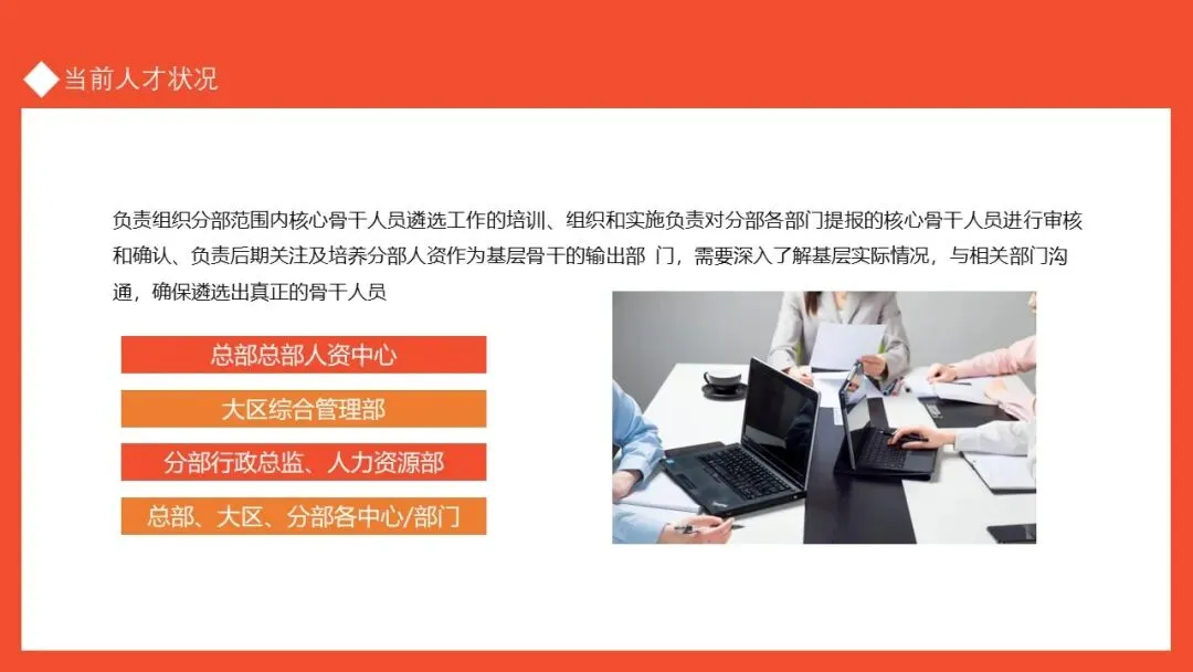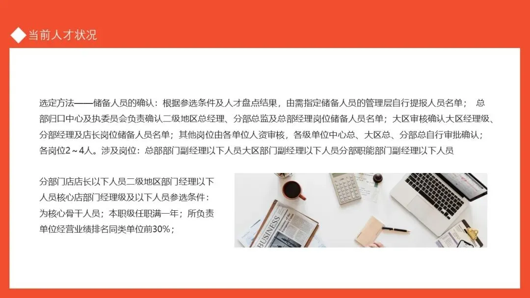 2.储备人员梯队:针对企业总部、大区、分部各部门副经理以下基层岗位,如总部主管、分部部门经理、门店副店长等,是企业人才梯队的基础。储备人员需为企业核心骨干,具备一定的任职资历和优秀的业绩表现,通过系统的培养和实践,逐步成长为企业的继任人员。