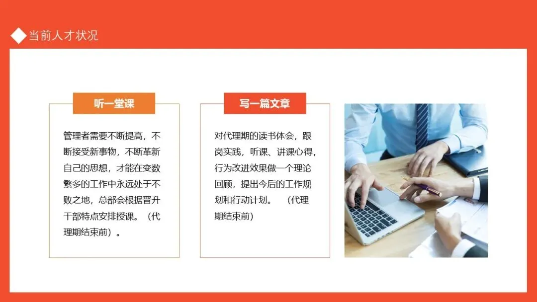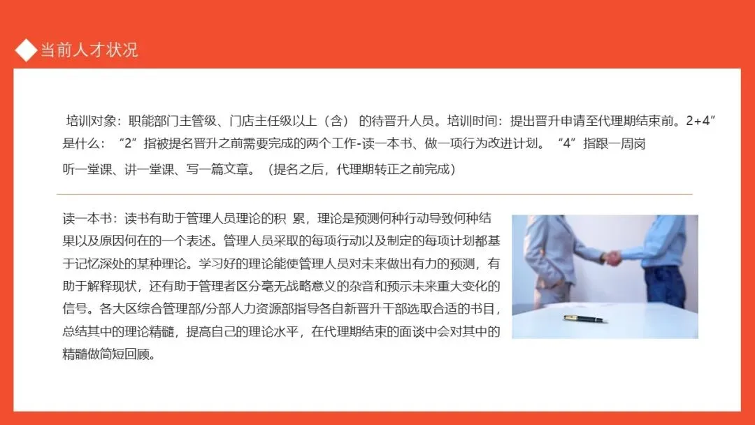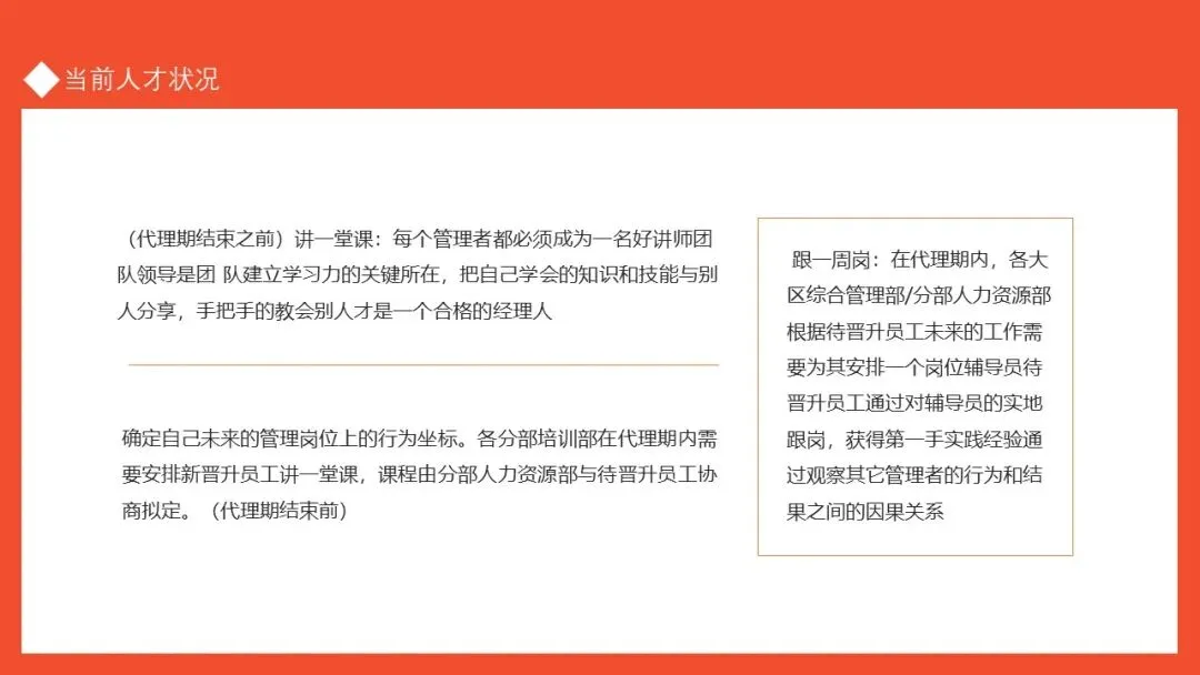 “2” 即提名晋升前完成 “读一本书、做一项行为改进计划”,通过读书积累理论知识,通过行为改进计划针对性弥补能力短板;“4” 即代理期转正前完成 “跟一周岗、听一堂课、讲一堂课、写一篇文章”,通过跟岗学习优秀管理者的实践经验,通过听课吸收专业知识,通过讲课锻炼表达和传授能力,通过写文章总结学习和实践心得,明确后续工作规划。