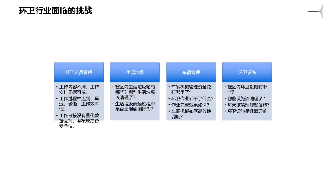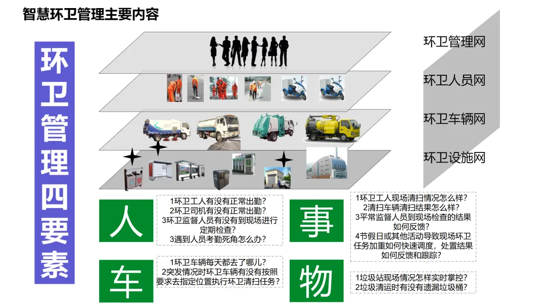 本方案以物联网、移动互联网及大数据技术为核心,聚焦环卫行业“人、车、物、事”四大管理要素,针对人员考勤监管难、车辆作业轨迹不明、设施状态掌控滞后、应急调度效率低等痛点,构建云化架构的智慧环卫管理体系,助力城市环卫实现智能化、精细化、高效化转型。