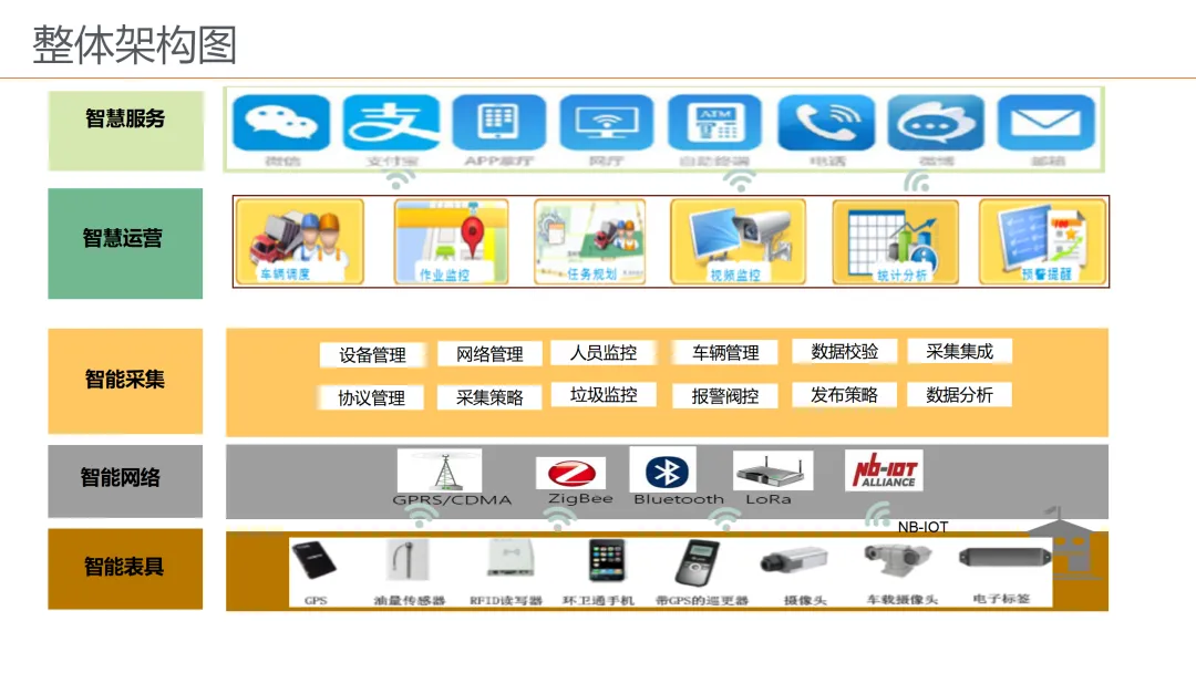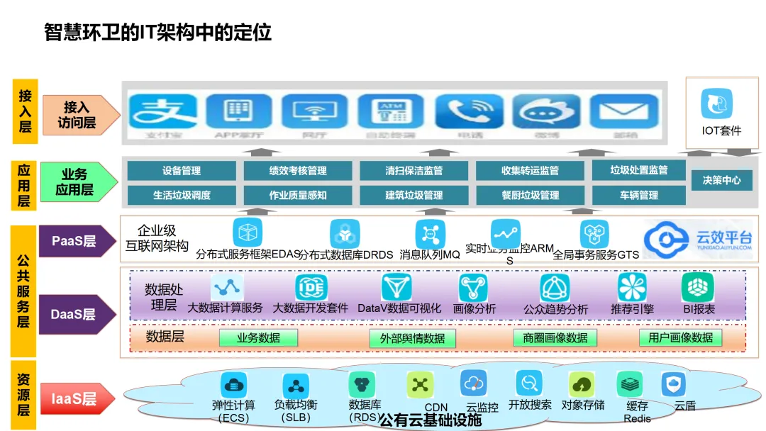 方案采用“公有云+分布式架构”设计,搭建涵盖资源层、数据层、PaaS层、应用层和公共服务层的全栈技术体系,整合弹性计算、分布式数据库、缓存、对象存储等云服务,依托NB-IoT、GPS、RFID等智能设备实现数据实时采集,通过云盾等安全服务保障数据传输与存储安全,符合等保三级等国内外安全标准。