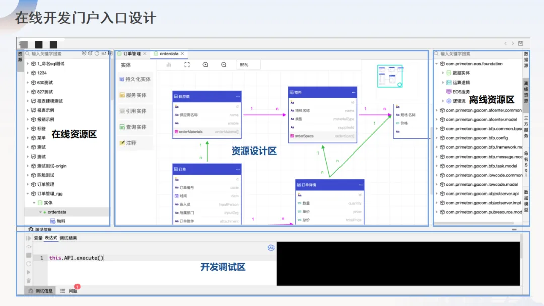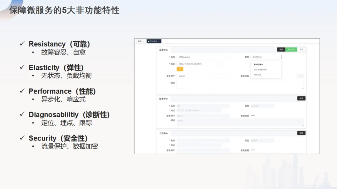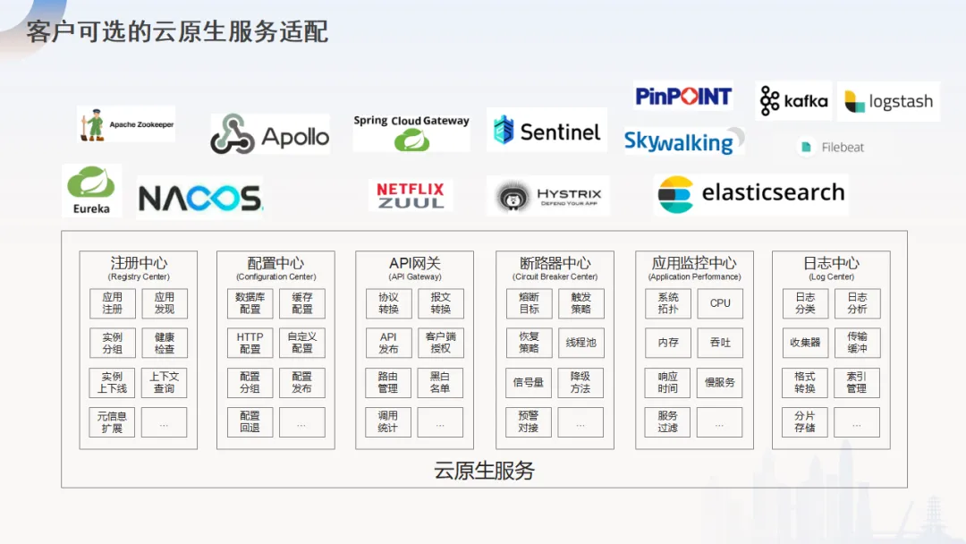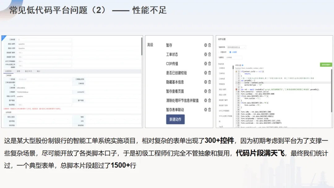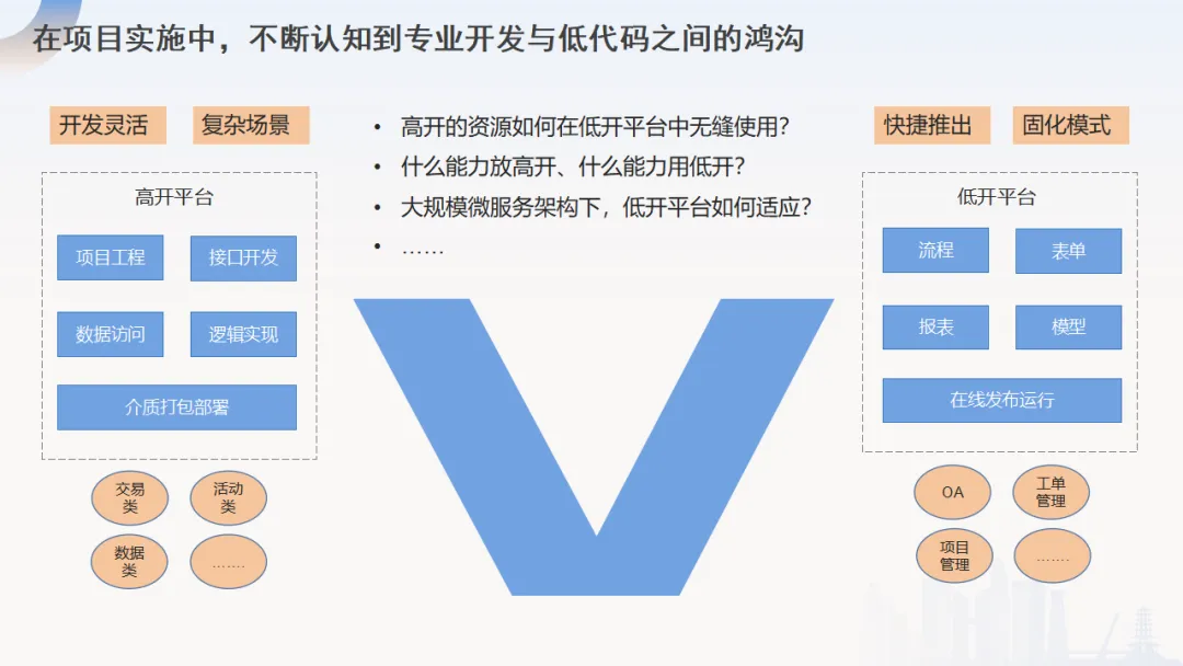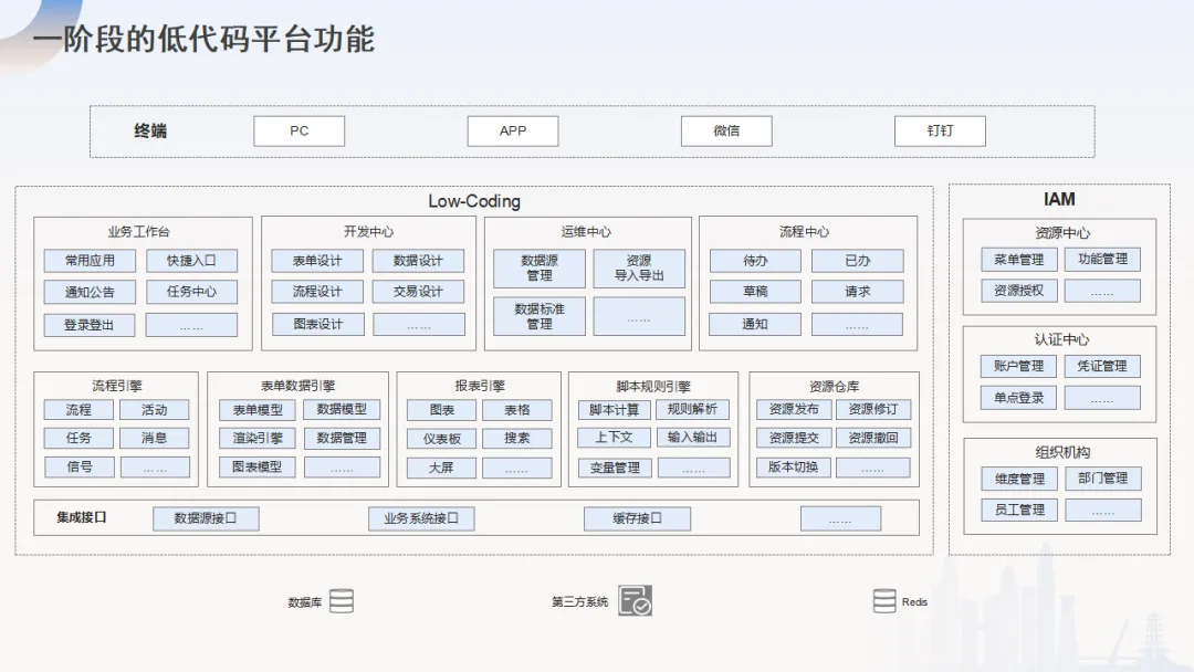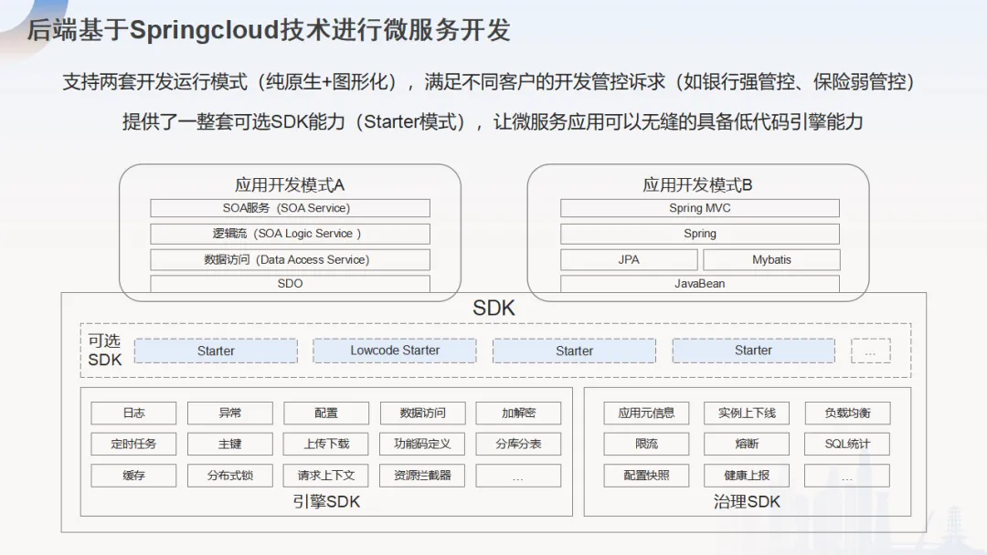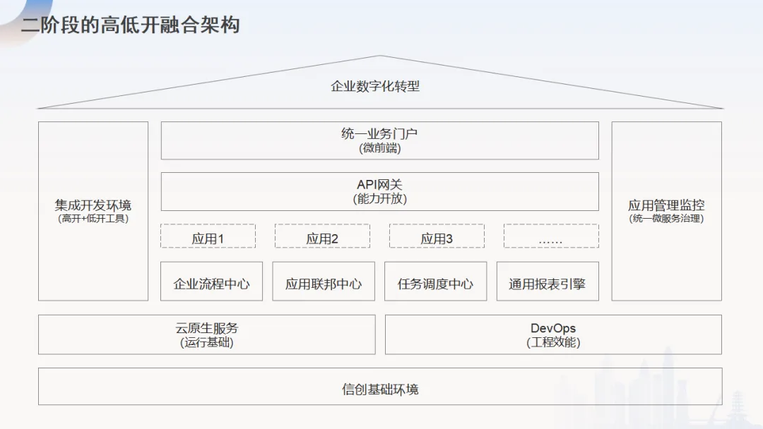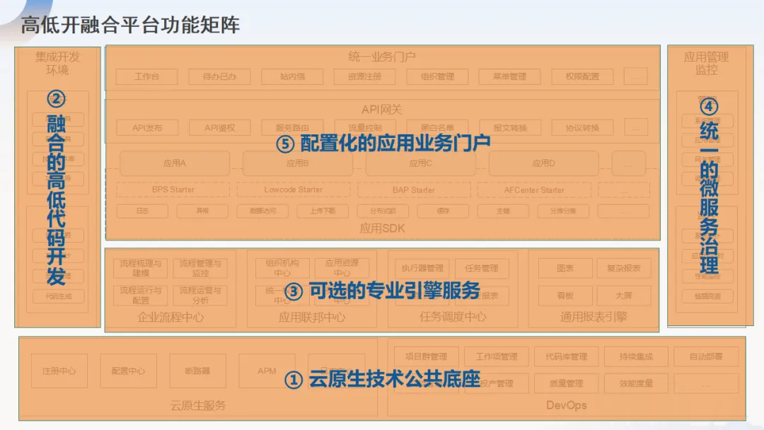 方案历经两阶段演化,从初期的在线快速配置平台,升级为融合专业开发与低代码配置的一体化解决方案,核心涵盖五大关键设计:云原生技术公共底座,提供注册中心、配置中心、API网关等基础服务,保障系统可靠弹性;高低开融合开发模式,支持纯原生与图形化两套开发运行模式,适配不同管控需求;可选专业引擎服务,包含流程、权限、报表等引擎,满足复杂业务场景;统一微服务治理,实现大规模应用的集中管理与监控;配置化应用业务门户,提供开箱即用的工作台、流程中心等功能。