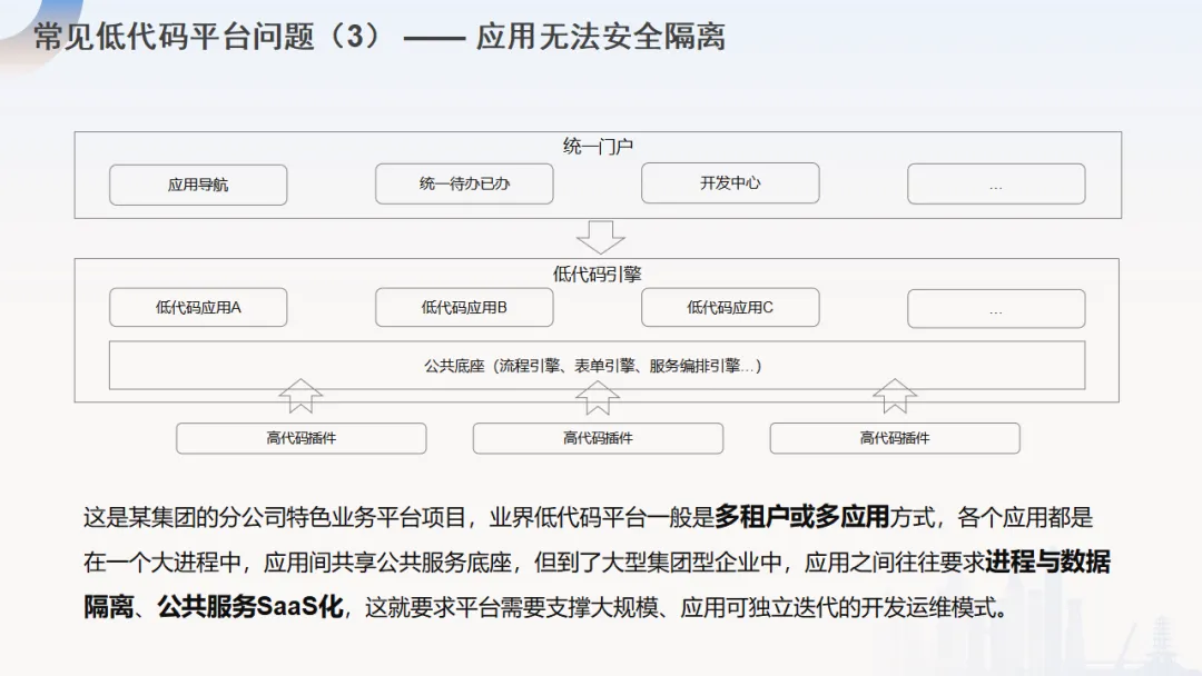 本方案针对当前低代码市场存在的业务覆盖宽泛、复杂需求难满足、技术架构固化等痛点,以及大型企业对系统集成、安全隔离、灵活扩展的核心诉求,构建了基于云原生微服务架构的高低开融合低代码平台,助力企业实现高效数字化转型。