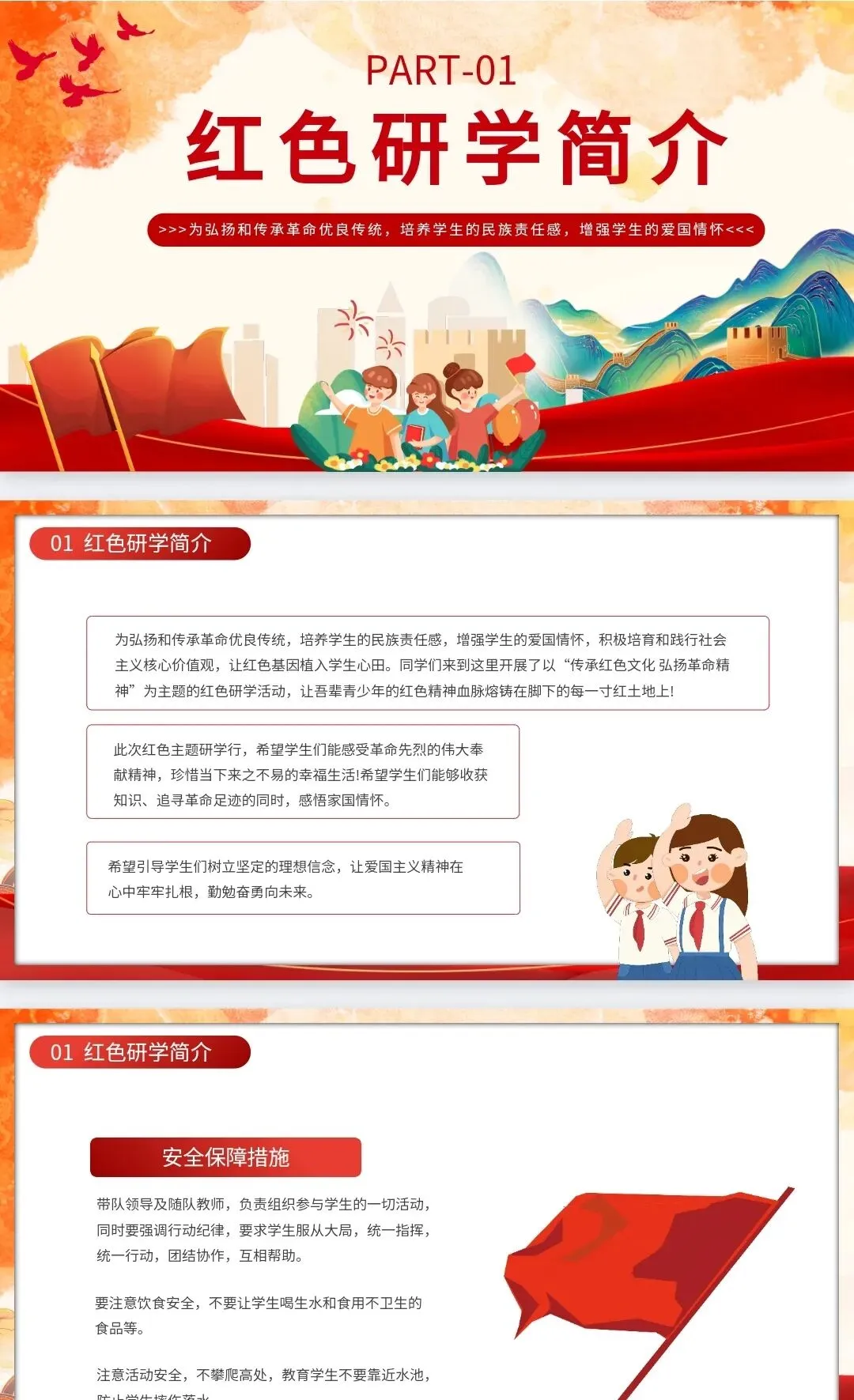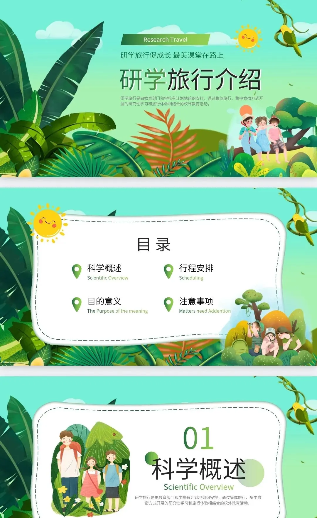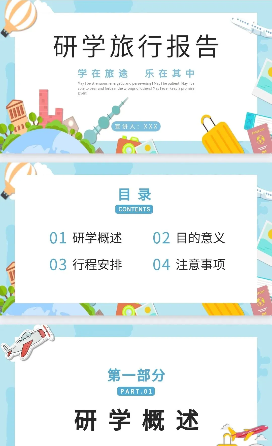 适用场景:中小学研学旅行策划、研学成果汇报、校外实践展示、研学基地宣传、亲子研学攻略分享等,涵盖研学主题介绍、行程规划、任务安排、实地探索、成果总结、心得感悟等核心模块,可自由编辑内容、替换研学实景照片。