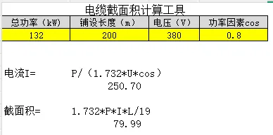 [案例]:总功率132kW、铺设长度200m、380V电压、cos取值0.8,我们将这4个参数输入到Excel中,很快就会出结果