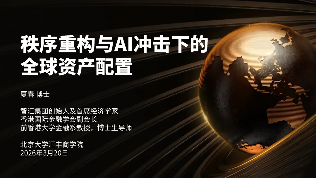 2026年3月20日晚,北京大学汇丰金融研究院特邀智汇集团创始人及首席经济学家、香港国际金融学会副会长夏春博士,以“秩序重构与AI冲击下的全球资产配置”为题,深度剖析了历史大周期下的宏观经济趋势、地缘博弈的资本印记,以及AI时代的投资新范式与务实策略,带来了一场极具洞察力与实战指导意义的精彩分享。以下为讲义内容分享。