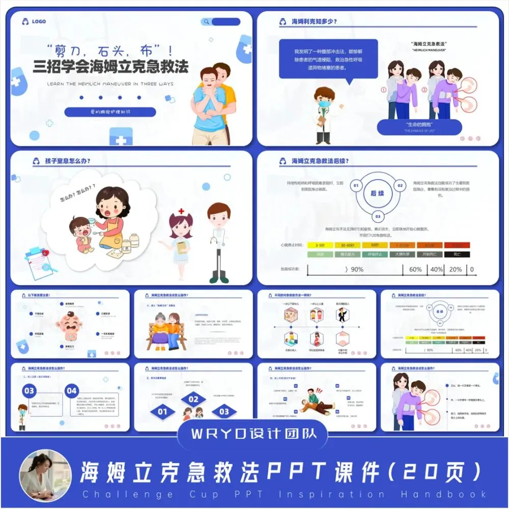 刷到这篇文章的你,一定要花3分钟看完——因为它可能会帮你挽救一条生命,避免一场无法挽回的悲剧。你有没有想过?一块糖果、一颗花生、一片果冻,甚至一口年糕,都可能成为夺走生命的“隐形杀手”。据统计,每年全球有超过50万儿童因异物窒息死亡,我国每年因气道异物梗阻死亡的儿童也近3000名,其中80%以上发生在家庭环境中,而70%的悲剧,都是因为现场无人掌握正确的急救方法导致的。更让人揪心的是,气道完全堵塞时,患者无法咳嗽、说话或呼吸,4分钟内大脑就会因缺氧而受损,黄金救援时间转瞬即逝,多一秒犹豫,就少一分生机。而海姆立克急救法,这一被称为“生命的拥抱”的急救术,正是应对这种危机的“救命武器”。它由美国胸外科医生海姆立克于1974年发明,至今已拯救超过100万人,被美国心脏协会(AHA)列为气道异物梗阻的首选急救术,纳入全球急救培训标准课程。但问题来了:很多人刷过无数急救视频,看似“一看就会”,可真遇到紧急情况,要么记不清操作步骤,要么找不准按压位置,甚至因操作不当造成二次伤害——就像常州一位老人卡喉后,家属情急之下错误使用海姆立克法,反而导致老人胃部撕裂,险些酿成大祸。不管你是家长、老师、医护人员,还是餐厅、商场等公共场所的工作人员,亦或是普通上班族,都需要一份专业、系统、好记、好用的海姆立克急救指南——而今天,我给大家带来的,就是能直接解决这个痛点的「20页动态海姆立克急救法PPT课件」。为什么强烈推荐这套PPT?不是我夸大,而是它真的做到了“即拿即用、一学就会”,不管是自己学习,还是用于培训、科普,都完全够用!拒绝碎片化知识,从急救背景、核心原理,到分场景操作、并发症预防,再到真实案例复盘、常见答疑,每一个知识点都讲得明明白白,新手也能快速吃透。- 成人清醒/无意识状态下的海姆立克操作(含自救方法);