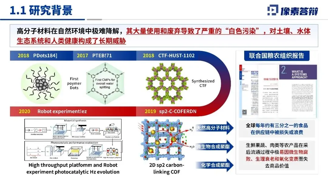 项目背景紧扣行业现实问题,既指出不可降解高分子材料引发的白色污染对生态和健康的威胁,也援引联合国粮农组织报告,说明食品采后腐败导致的严重浪费现状。研究现状明确该领域前沿方向为废弃生物质开发碳量子点增强可降解保鲜膜,同时梳理出规模化工艺瓶颈、CQDs长期安全性待验证两大核心挑战,且已有研究为项目开展奠定了材料与技术基础。