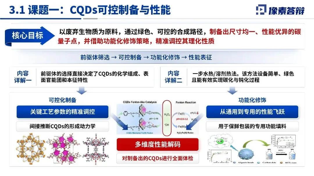 课题分解形成闭环研究链条,五大课题围绕生物质碳量子点可控制备、结构性能调控、复合膜主动保鲜性能等核心方向层层推进。研究内容聚焦绿色合成、功能化修饰、构效关系揭示等关键环节,明确了前驱体筛选、复合膜构筑、实际保鲜验证等关键任务,逻辑清晰,核心目标明确,为项目实施筑牢研究框架。
