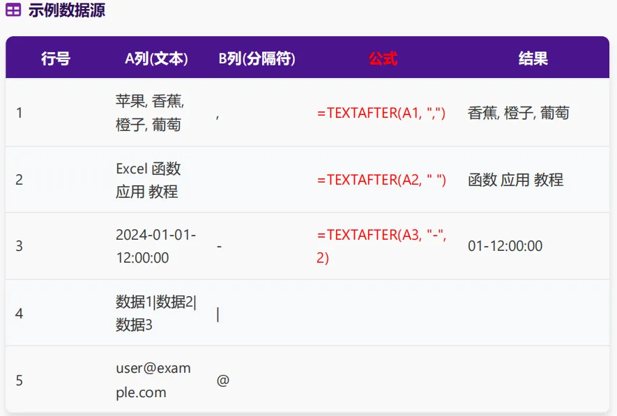 TEXTAFTER函数是Excel中常用的文本处理函数,用于返回文本中指定分隔符之后的部分,广泛应用于数据清洗、文本处理等场景。