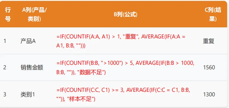 功能:使用COUNTIF进行计数,根据计数结果进行条件判断,然后使用AVERAGE和IF进行条件平均值计算