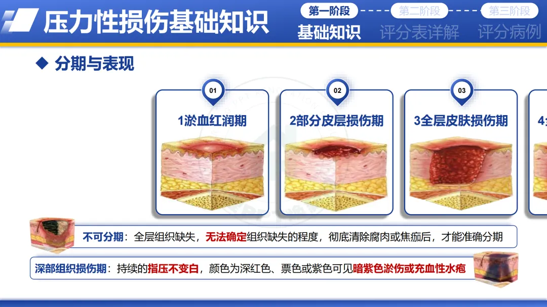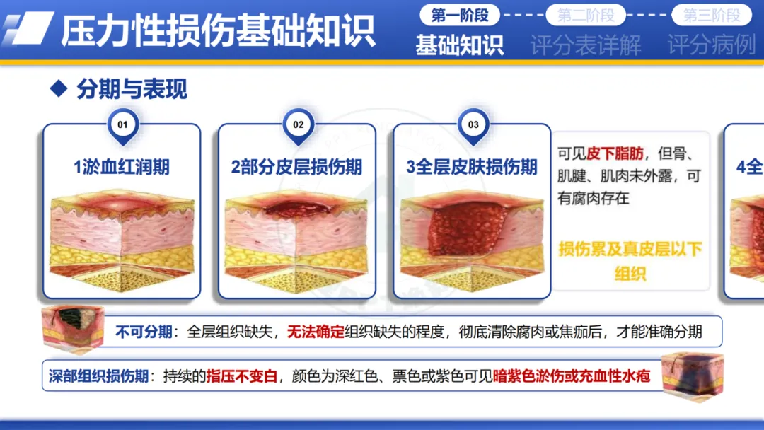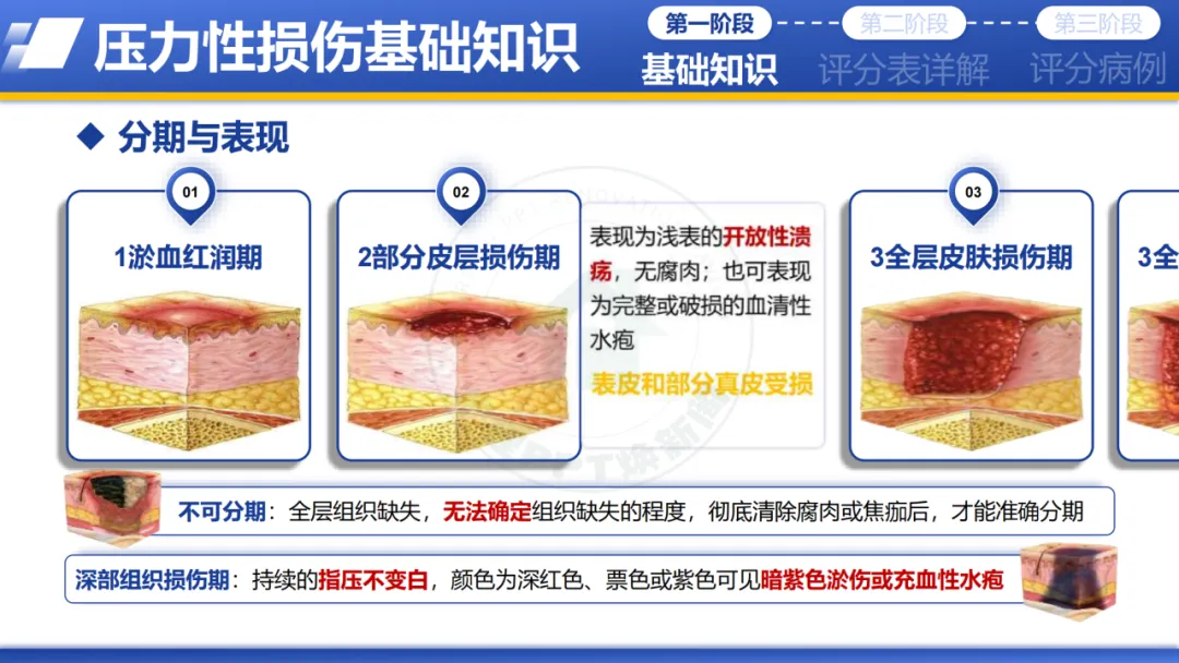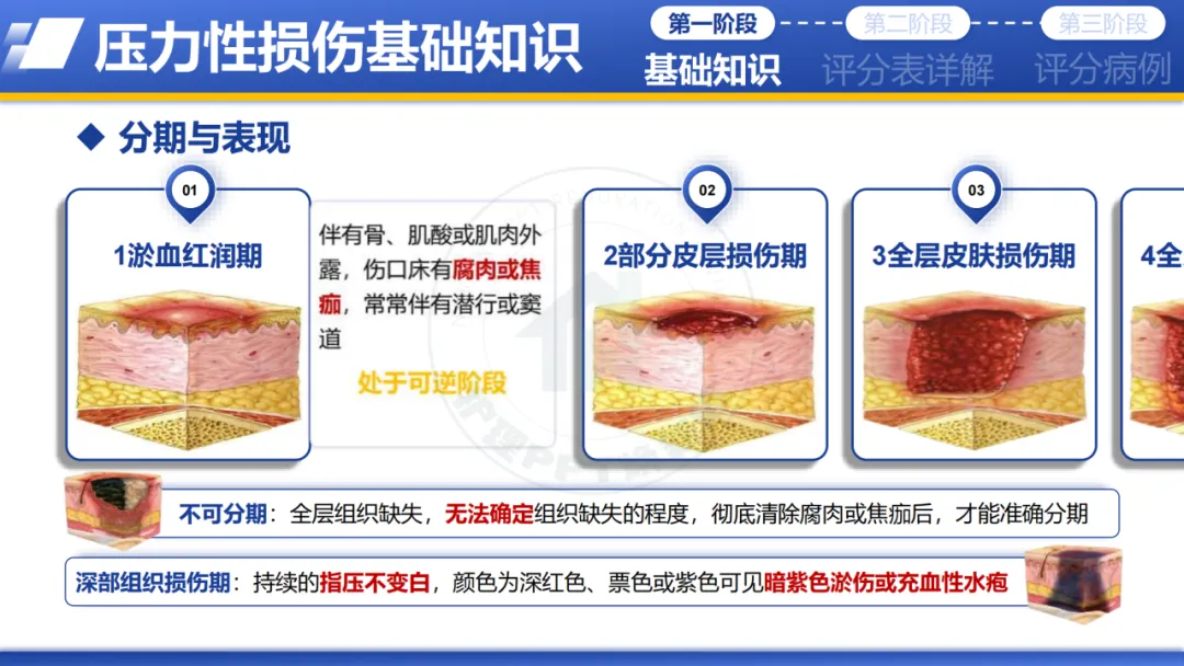 1期处于可逆阶段、2期部分皮层损伤、3期全层皮肤损伤、4期全层组织损伤,逐级加重🙀。