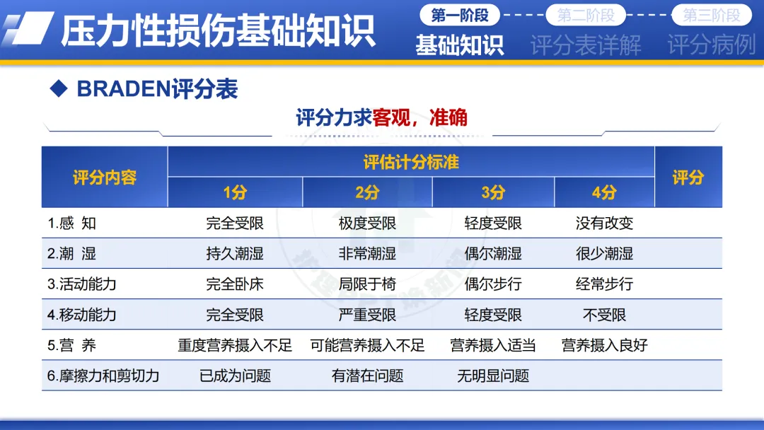 各位同事好,今天我业务学习的主题是“压力性损伤评分表详解”,重点解析BRADEN评分表。