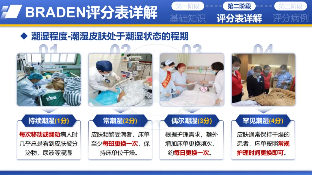 潮湿程度从持续潮湿1分到罕见潮湿4分,皮肤长期处于潮湿状态是压疮重要诱因。