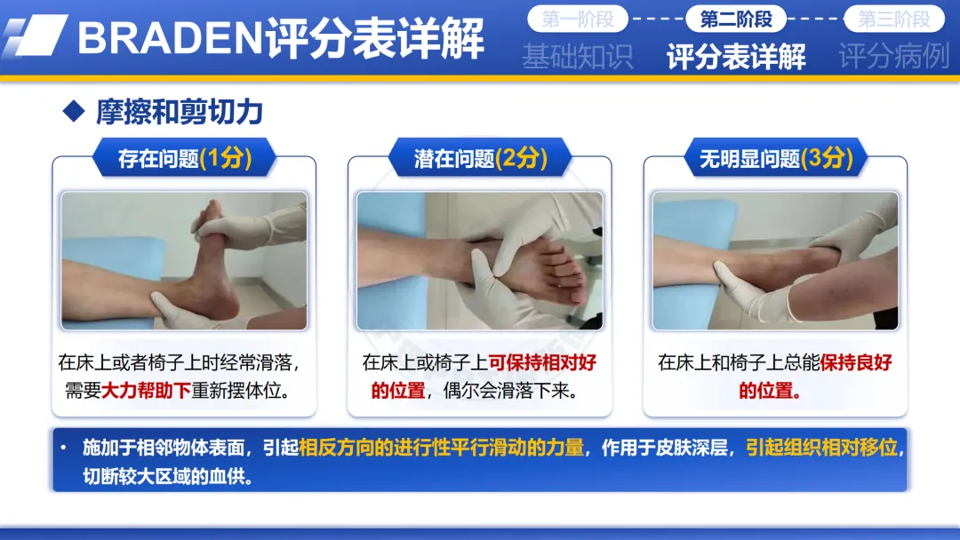 摩擦力和剪切力从存在问题1分到无明显问题3分,是评估体位稳定性及皮肤受力的💕关键指标。