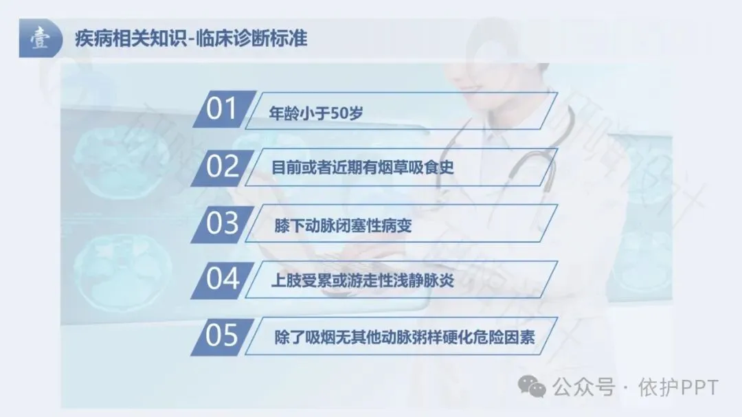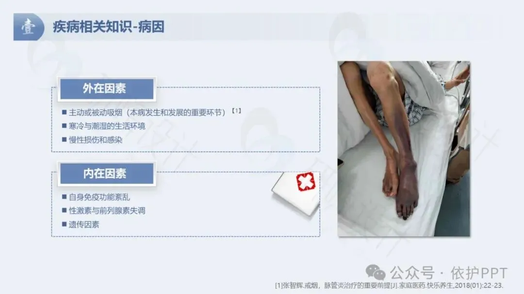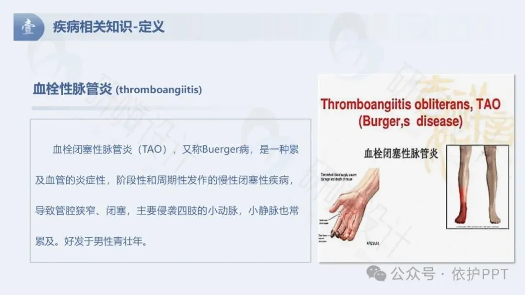 血栓闭塞性脉管炎(TAO),又称Buerger病,是一种累及血管的炎症性,阶段性和周期性发作的慢性闭塞性疾病,导致管腔狭窄、闭塞,主要侵袭四肢的小动脉,小静脉也常累及。好发于男性青壮年。