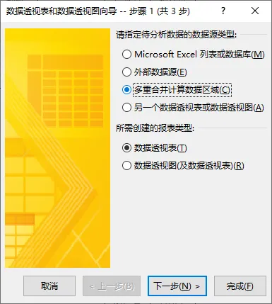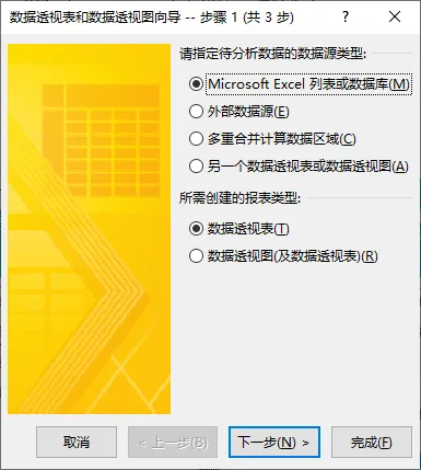 通常,保持默认选项(“Microsoft Excel 列表或数据库”及“数据透视表”),直接点击“完成”即可快速创建透视表!不必再动用鼠标去菜单里选择插入...