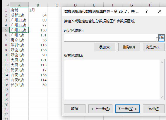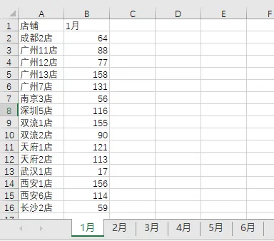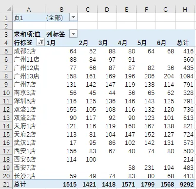 其中的“行”是你的业务数据(如店铺名),“列”是各个被添加的区域,而“值”就是你需要统计的数字。(如果各个月的行数不相等,在添加区域的时候行数要多框选一些,防止漏掉某些行,并且透视表里的值要把计数改成求和,否则全是1)