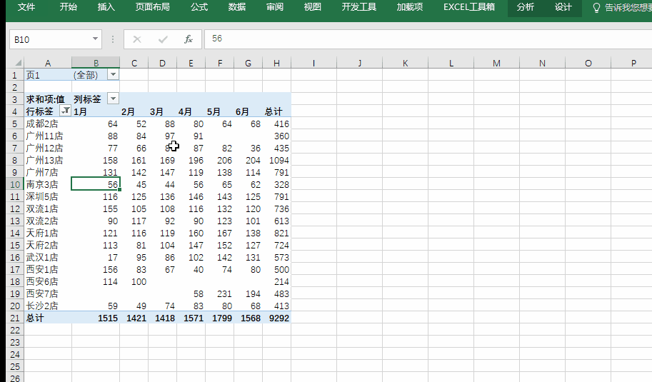 根据上个例子生成的透视表,直接插入图表,同时选中透视表——菜单栏——分析——插入切片器——选择“列”(月份在列上),动态图表制作完成了,就是这么简单!