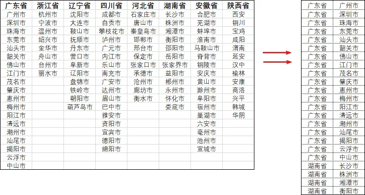 如下图,使用ALT+D+P这个快捷键,我们可以快速地把左边的数据进行拆分转换: