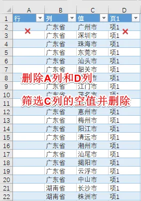 - 删除没用的A/D列,然后对C列(值)进行筛选,把空白行删掉就得到了我们想要的结果