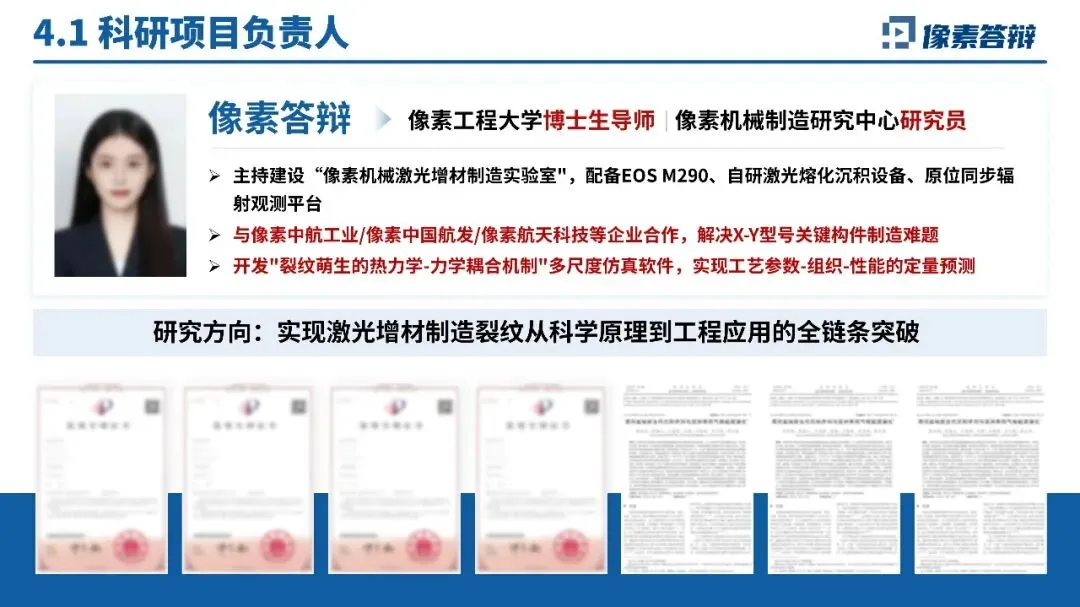 开篇定调踩准高端制造国家战略,采用「左右双栏对称」排版,锚定航空发动机叶片修复、高性能合金制造的工程刚需,左栏讲产业需求,右栏拆解科学目标,精准点出高裂纹敏感性合金可打印性的行业卡脖子痛点,开篇就立住项目战略高度与立项必要性。